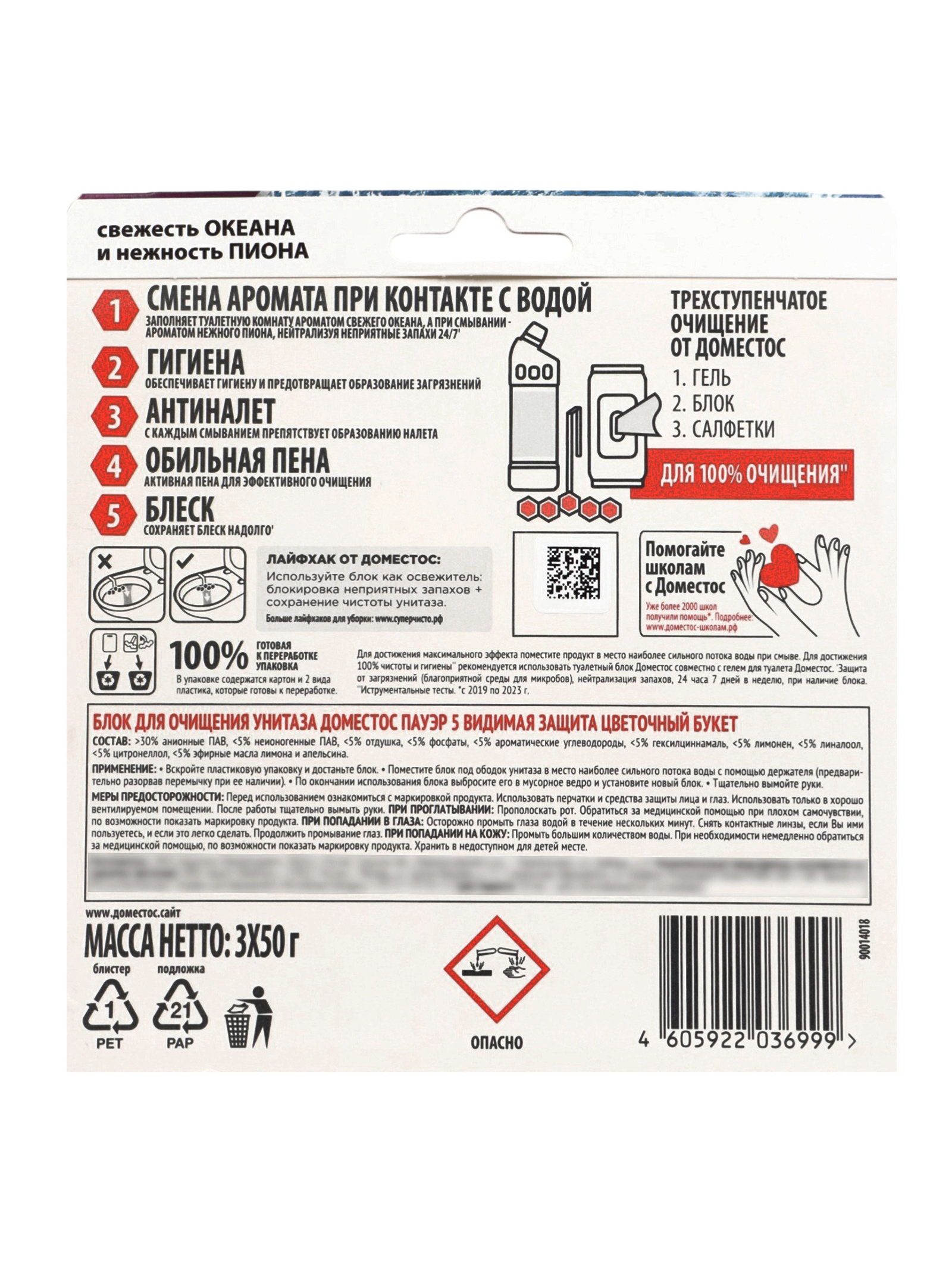 Туалетные блоки для очищения унитаза свежесть океана и нежность пиона, 3 шт. по 50 г, Доместос, Россия