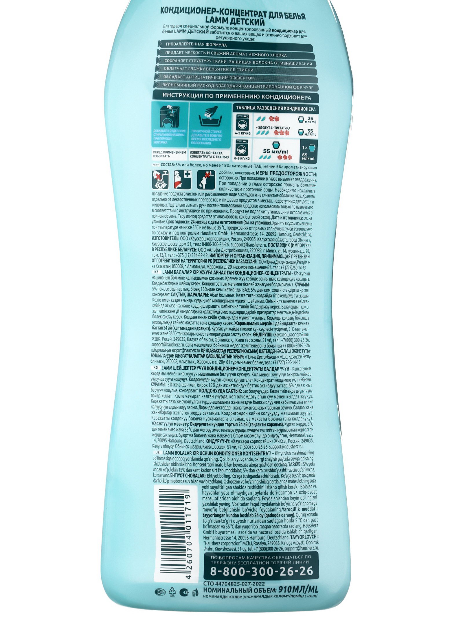 Кондиционер для белья Детский, концентрат, гипоаллергенный, 910 мл, 910 мл., Lamm, Россия