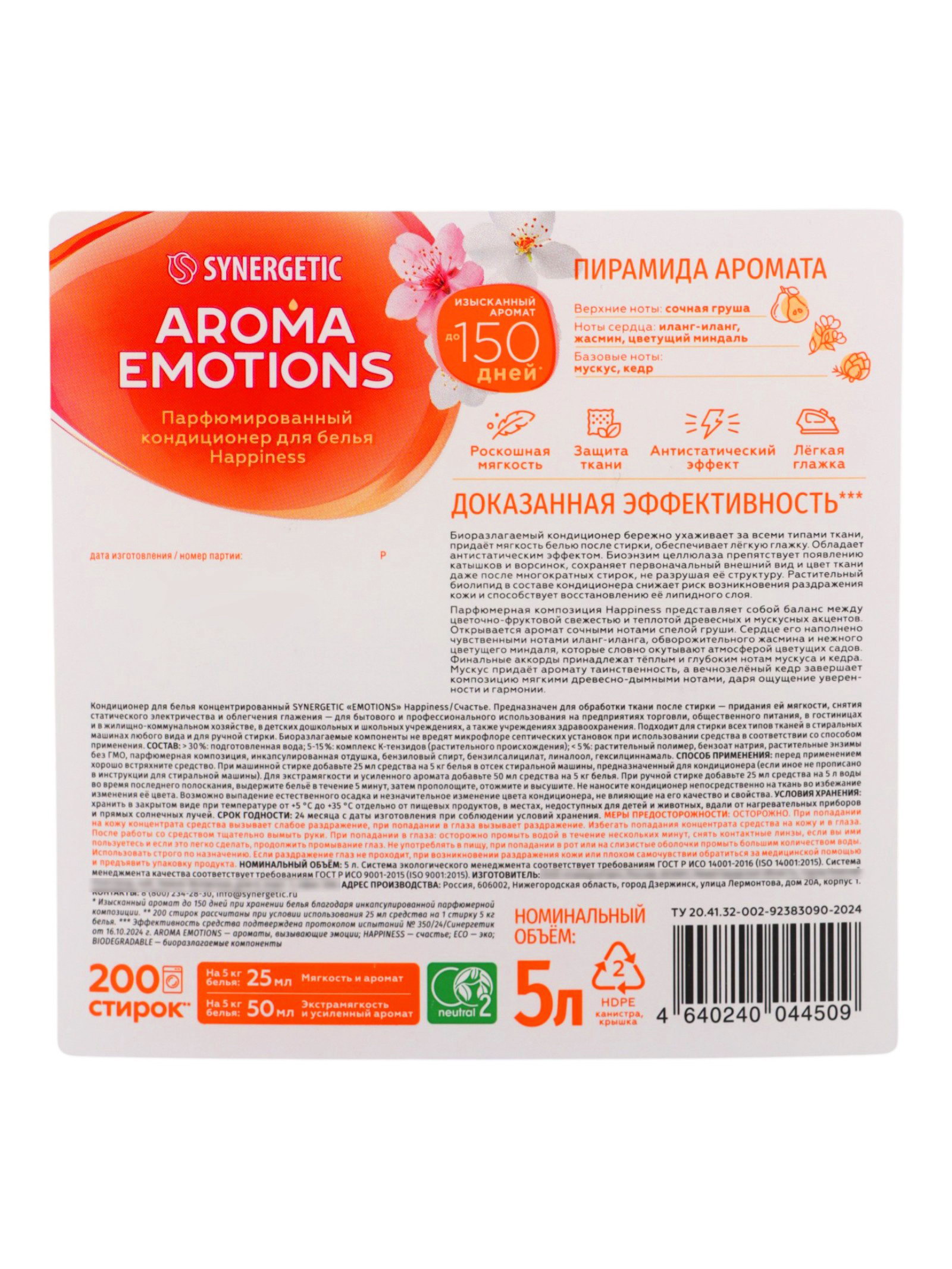Аромат: Груша, Жасмин, Миндаль Размер упаковки: 13 x 27.5 x 18 см. tnved: 3402500000 Запрет реализации по сегментам: 00000000208 Температурное ограничение: Нет Назначение: Для всех видов тканей Особенности средства: Концентрат Парфюмированный кондиционер для белья SYNERGETIC "Миндаль, Груша, Жасмин", 5 л это концентрированное средство для ухода за всеми видами тканей, которое придаёт белью мягкость, свежесть и длительный утончённый аромат после каждой стирки. Кондиционер облегчает глажение, поддерживает эластичность и форму тканей, делая их приятными на ощупь и ухоженными. Формула средства разработана на основе биоразлагаемых компонентов, безопасна для кожи и окружающей среды. Кондиционер гипоаллергенен, не вызывает раздражения, подходит для людей с чувствительной кожей и обеспечивает бережный уход за тканями при частом использовании. Уникальный ароматический букет миндаль, груша и жасмин наполняет бельё мягким и свежим ароматом, создавая ощущение комфорта и чистоты. Кондиционер подходит для всех типов тканей, включая хлопок, синтетику и деликатные материалы, и может использоваться как при машинной, так и при ручной стирке. Преимущества парфюмированного кондиционера SYNERGETIC "Миндаль, Груша, Жасмин", 5 л: