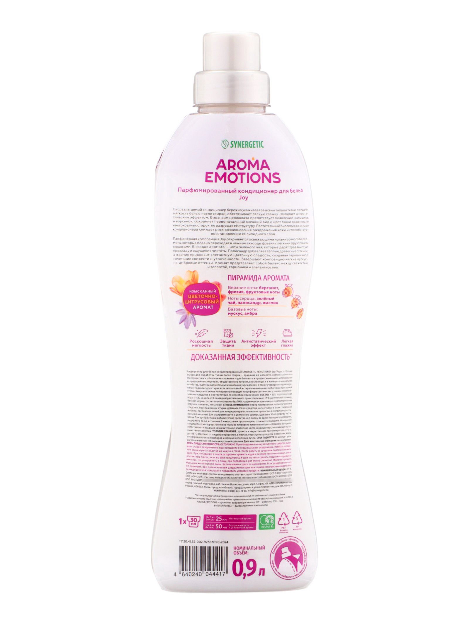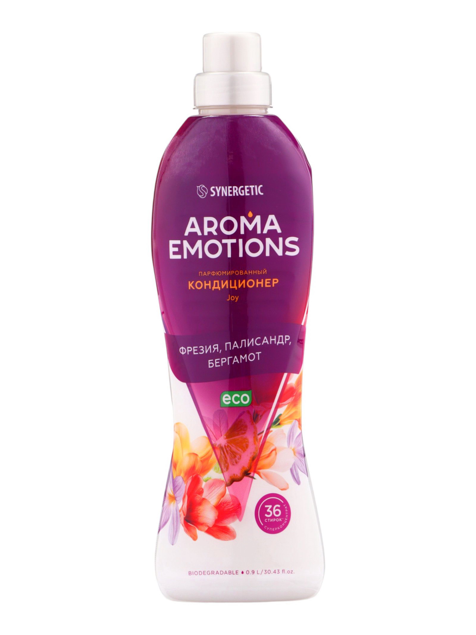 Кондиционер для белья парфюмированный фрезия, палисандр, бергамот, 0.9 л, 900 мл., Synergetic, Россия
