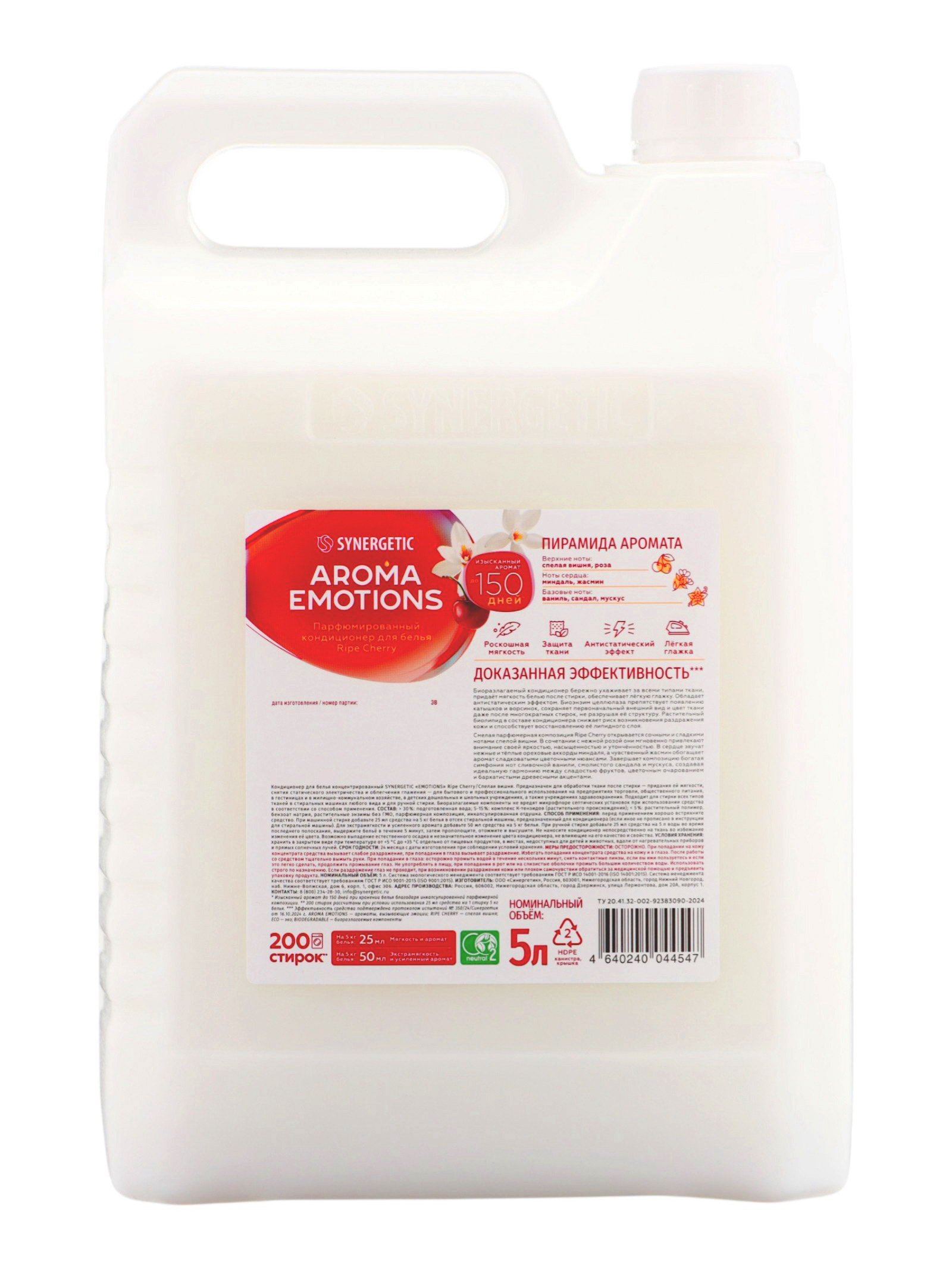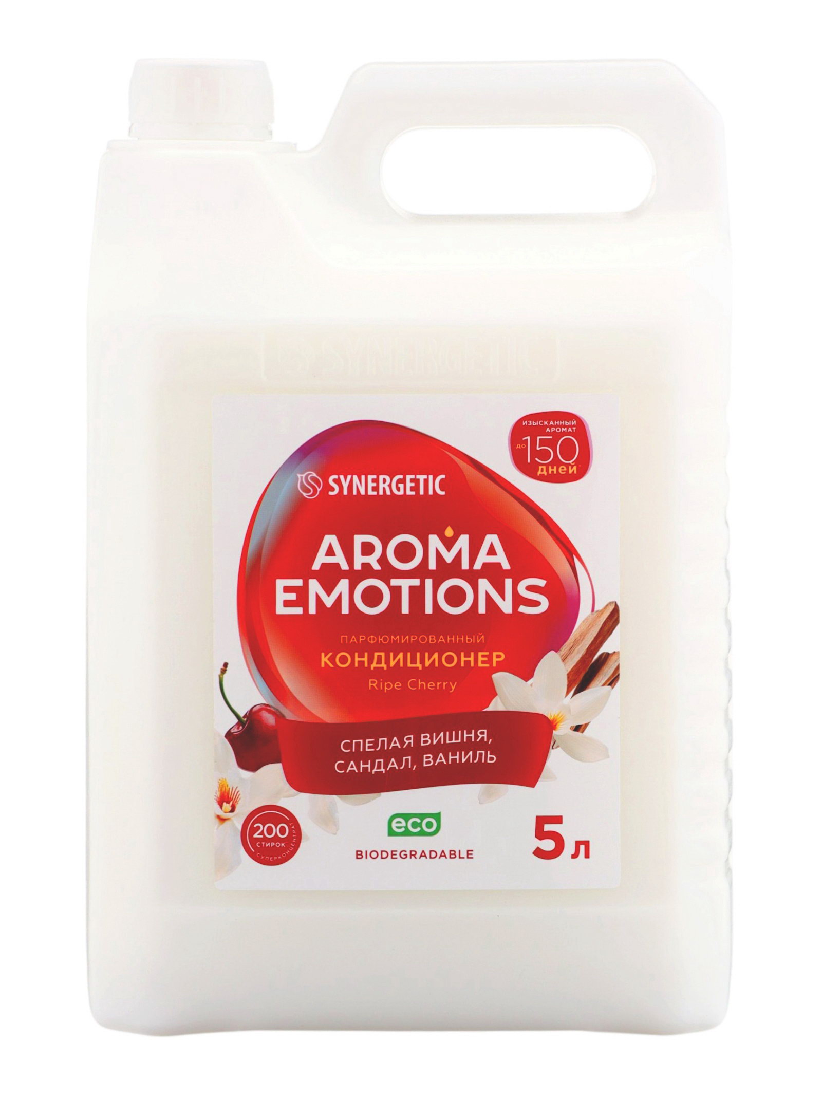 Аромат: Ваниль, Вишня, Сандал Размер упаковки: 13 x 27.5 x 18 см. tnved: 3402500000 Запрет реализации по сегментам: 00000000208 Температурное ограничение: Нет Назначение: Для всех видов тканей Особенности средства: Концентрат Парфюмированный кондиционер для белья SYNERGETIC "Вишня, Сандал, Ваниль", 5 л это концентрированное средство для ухода за всеми типами тканей, которое придаёт белью мягкость, комфорт и длительный аромат после каждой стирки. Кондиционер облегчает глажение, сохраняет эластичность и форму тканей, делая их приятными на ощупь, ухоженными и ароматными. Формула средства разработана на основе биоразлагаемых компонентов, безопасна для кожи и окружающей среды. Кондиционер гипоаллергенен, подходит для людей с чувствительной кожей, предотвращает раздражение и обеспечивает бережный уход за тканями при частом и регулярном использовании. Уникальный ароматический букет вишня, сандал и ваниль наполняет бельё мягким, фруктово-древесным и утончённым ароматом, создавая ощущение свежести и уюта после каждой стирки. Средство подходит для всех типов тканей, включая хлопок, синтетику и деликатные материалы, и может использоваться как при машинной, так и при ручной стирке. Преимущества парфюмированного кондиционера SYNERGETIC "Вишня, Сандал, Ваниль", 5 л: