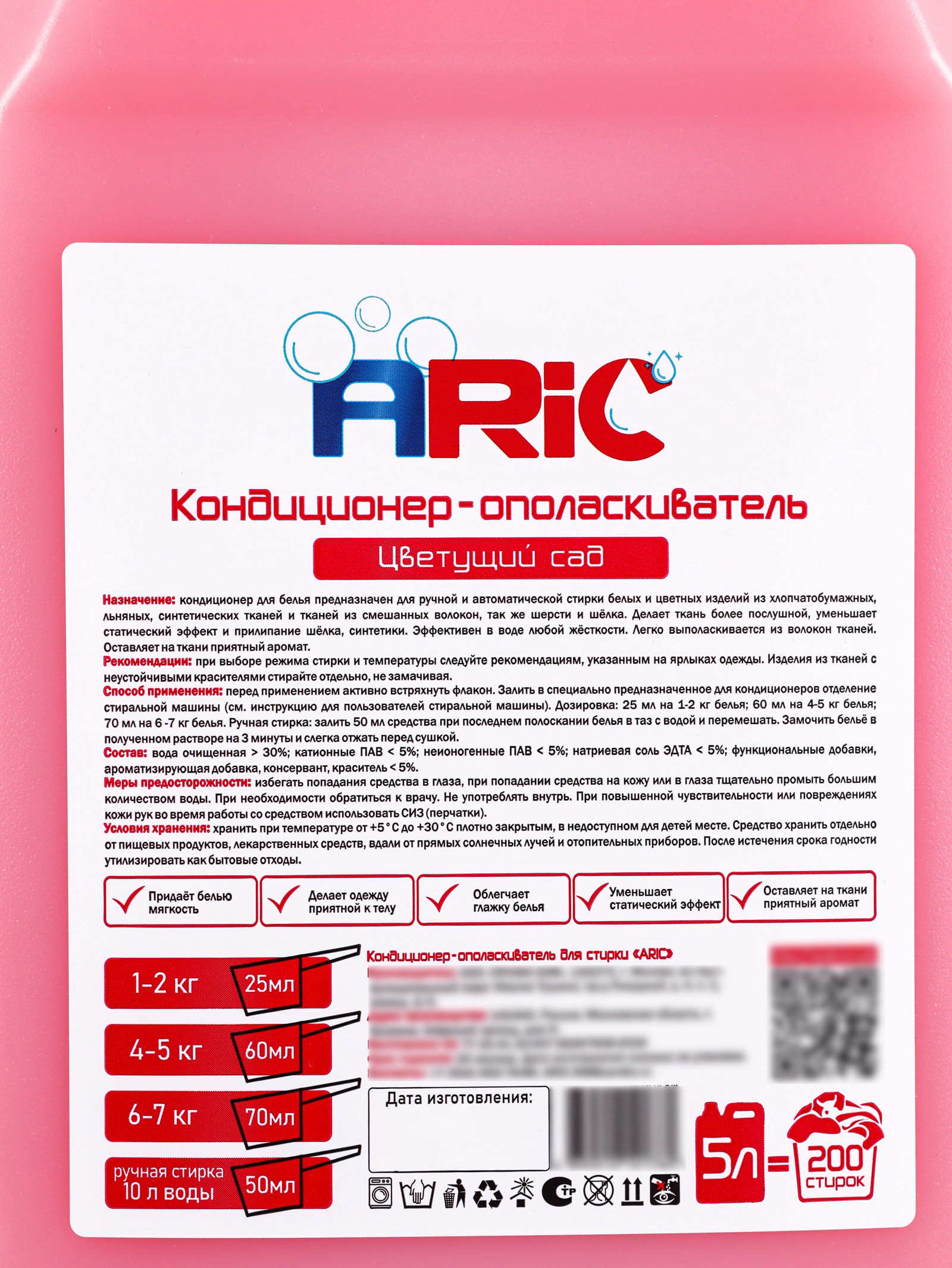Назначение: Для всех видов тканей, Для цветных тканей Размер упаковки: 13 x 29.5 x 17 см. tnved: 3402500000 Запрет реализации по сегментам: 00000000208 Температурное ограничение: Нет Аромат: Цветы Особенности средства: Антистатический эффект Кондиционер-ополаскиватель для белья ARIC "Цветущий сад" в объёме 5 литров это практичное и экономичное решение для регулярного ухода за одеждой и домашним текстилем. Благодаря увеличенному объёму средство идеально подходит для семейного использования, а также для прачечных и частого применения. Кондиционер эффективно смягчает ткани, делает их более приятными на ощупь и помогает сохранить первоначальный вид вещей даже после многократных стирок. Формула средства деликатно воздействует на волокна тканей, снижая их износ и предотвращая появление жёсткости. После применения одежда меньше электризуется, легче гладится и дольше сохраняет свежесть. Аромат "Цветущий сад" раскрывается мягкими цветочными нотами, создавая ощущение чистоты и уюта, которое сохраняется на протяжении длительного времени. Средство подходит для всех типов тканей, включая деликатные материалы, и может использоваться как при машинной, так и при ручной стирке. Благодаря хорошей растворимости кондиционер полностью выполаскивается, не оставляя следов и разводов. | ||