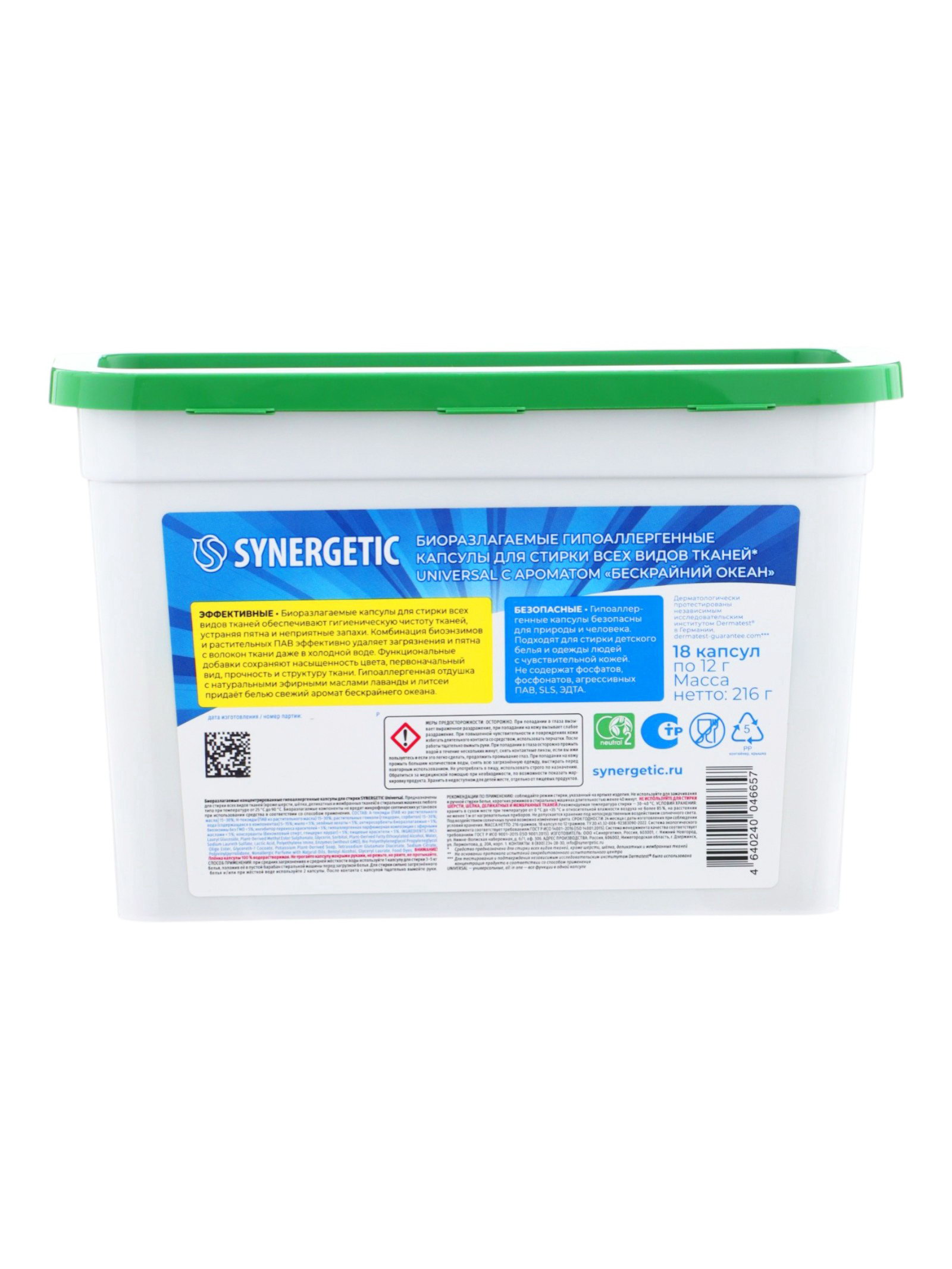 Капсулы для стирки белья универсальные бескрайний океан, 18 шт., Synergetic, Россия