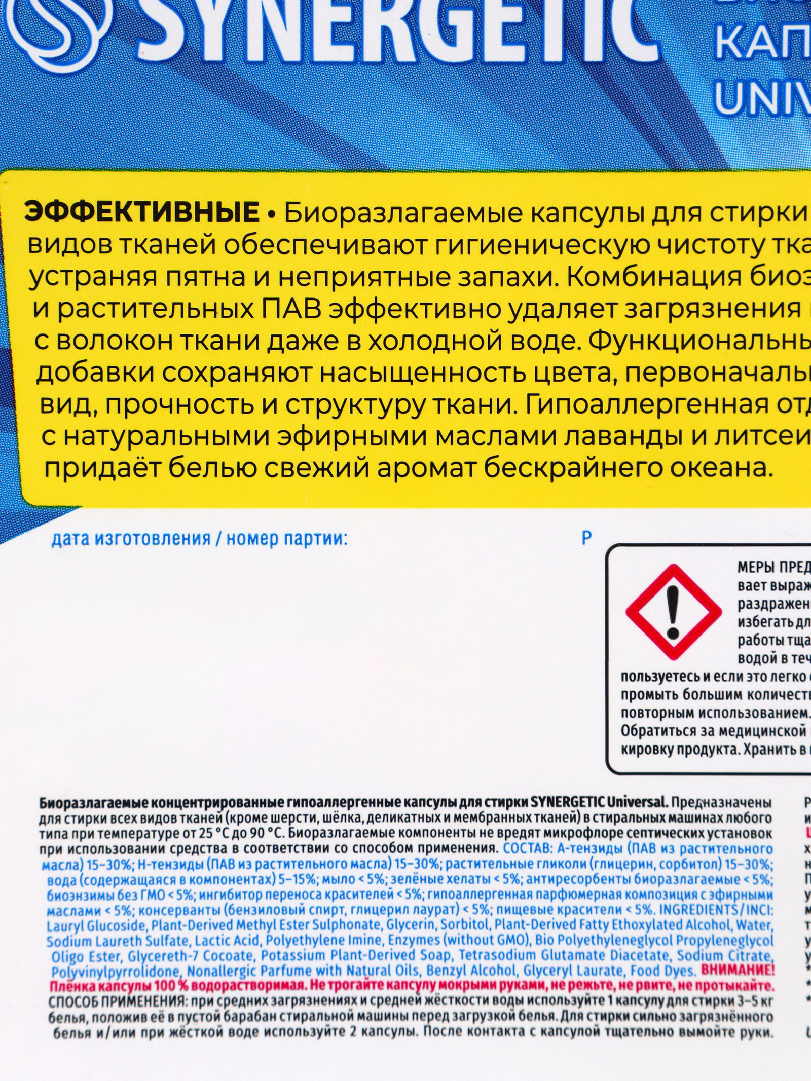 Назначение: Для всех видов тканей, Для детского белья, Для цветных тканей Размер упаковки: 7.5 x 12.5 x 19 см. tnved: 3402500000 Запрет реализации по сегментам: 00000000208 Температурное ограничение: Нет В упаковке, шт.: 18 Универсальные капсулы для стирки белья SYNERGETIC "Бескрайний океан", 18 шт это удобное и эффективное средство для стирки всех типов тканей, которое сочетает высокую очистительную способность с приятным ароматом. Каждая капсула содержит концентрированную формулу, легко растворяется в воде и обеспечивает равномерное распределение активных компонентов по белью. Формула капсул разработана с использованием биоразлагаемых компонентов, безопасна для кожи и окружающей среды. Средство мягко удаляет загрязнения, пятна и неприятные запахи, не повреждает волокна тканей и сохраняет их мягкость и комфорт. Аромат "Бескрайний океан" придаёт белью свежесть и лёгкое ощущение чистоты после каждой стирки. Капсулы SYNERGETIC подходят для машинной стирки при разных температурах и для всех типов тканей, включая хлопок, синтетику и смешанные материалы. Они экономичны в использовании: одна капсула рассчитана на одну стирку. Преимущества универсальных капсул SYNERGETIC "Бескрайний океан", 18 шт: