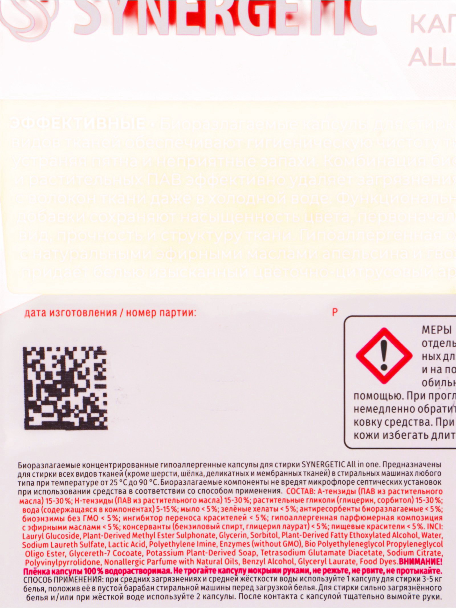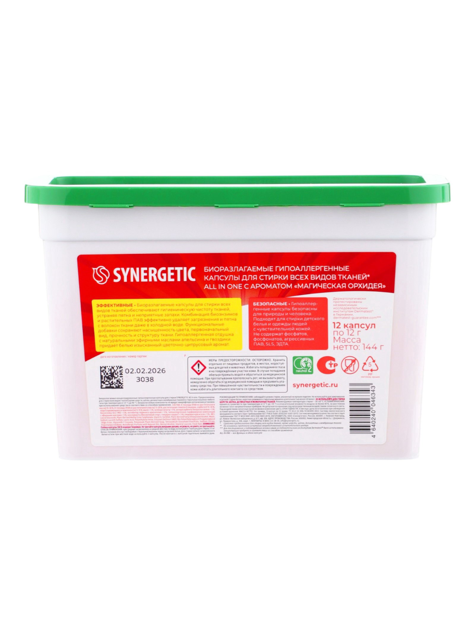 Капсулы для стирки белья биоразлагаемые ALL IN ONE гипоаллергенные, 12 шт., Synergetic, Россия