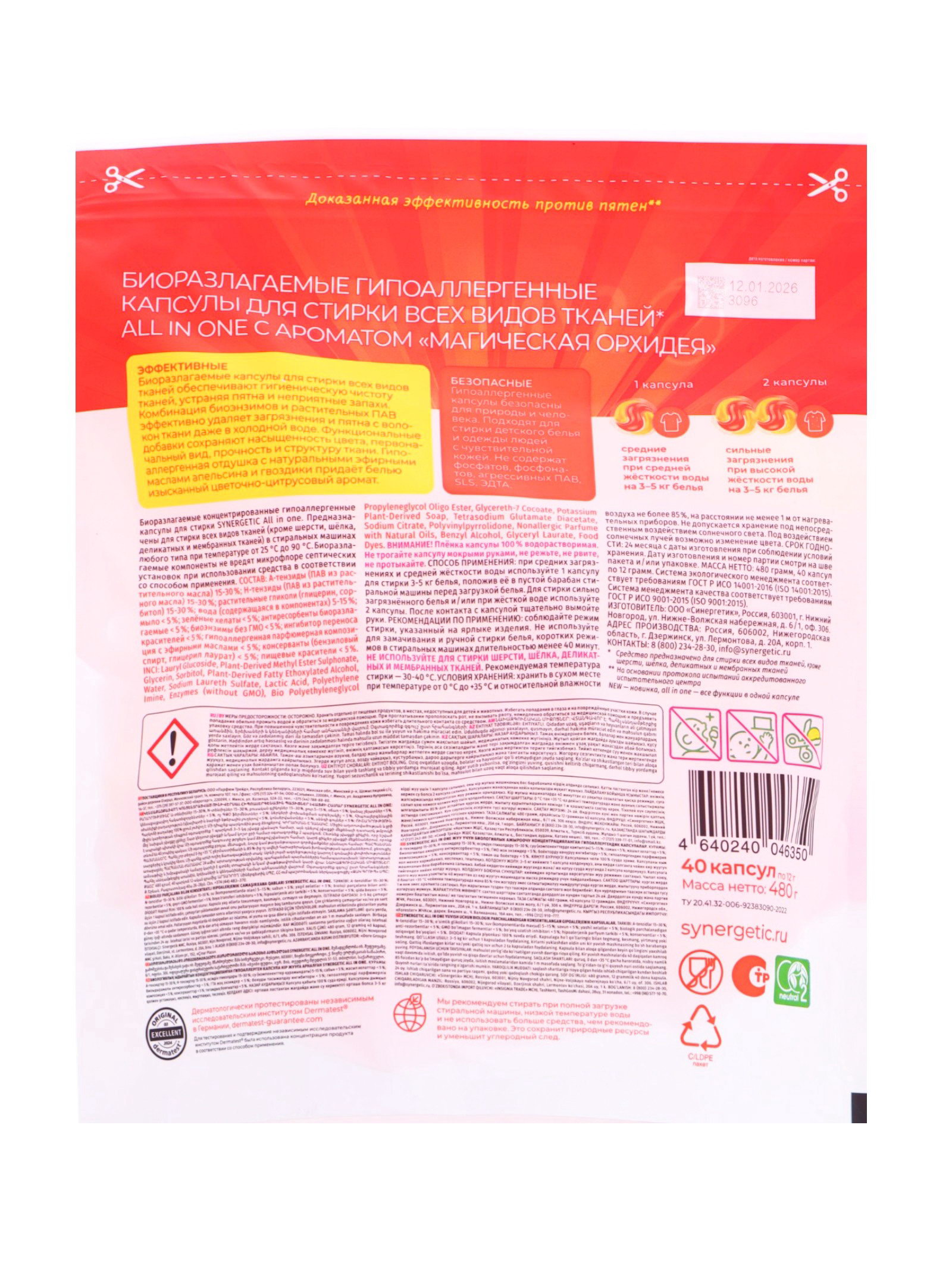 Назначение: Для всех видов тканей, Для детского белья, Для цветных тканей Размер упаковки: 20 x 4 x 20 см. tnved: 3402500000 Запрет реализации по сегментам: 00000000208 Температурное ограничение: Нет В упаковке, шт.: 40 Биоразлагаемые капсулы для стирки белья SYNERGETIC ALL IN ONE, гипоаллергенные, 40 шт это концентрированное и удобное средство для комплексной стирки всех видов тканей. Каждая капсула содержит оптимальную дозу моющего средства, которое эффективно удаляет загрязнения, пятна и неприятные запахи, при этом бережно ухаживает за тканями, сохраняя их мягкость и комфорт. Формула капсул создана на основе биоразлагаемых компонентов, безопасна для кожи и окружающей среды. Гипоаллергенная рецептура делает средство подходящим для людей с чувствительной кожей и склонных к аллергическим реакциям. Концентрированная формула обеспечивает экономичный расход, а удобная упаковка позволяет легко дозировать средство: одна капсула рассчитана на одну стирку. Капсулы SYNERGETIC ALL IN ONE подходят для всех типов тканей хлопка, синтетики, смешанных материалов и для машинной стирки при любых температурах. Средство растворяется в воде полностью, не оставляет следов и обеспечивает равномерное распределение активных компонентов. Преимущества биоразлагаемых капсул SYNERGETIC ALL IN ONE, 40 шт: