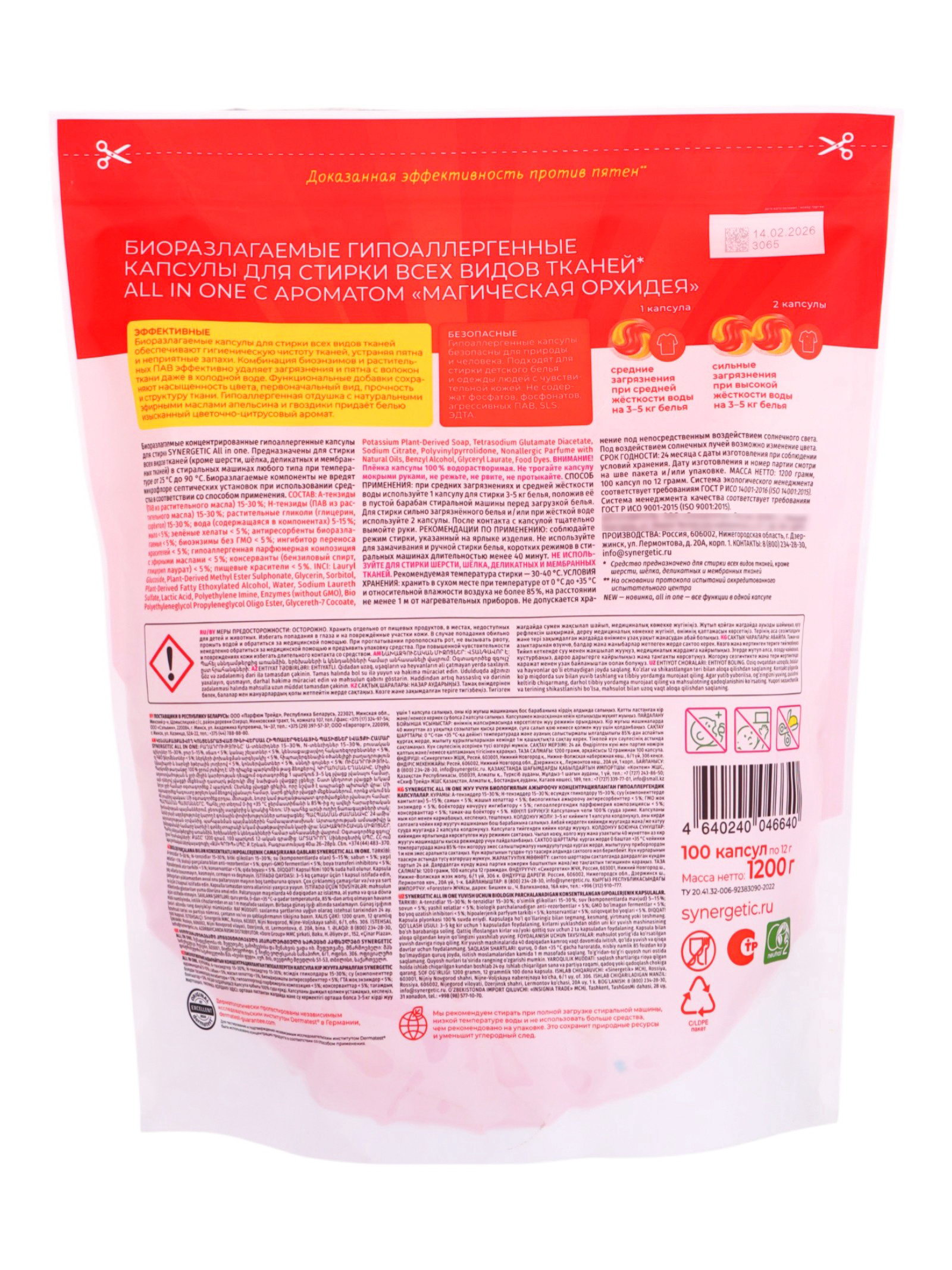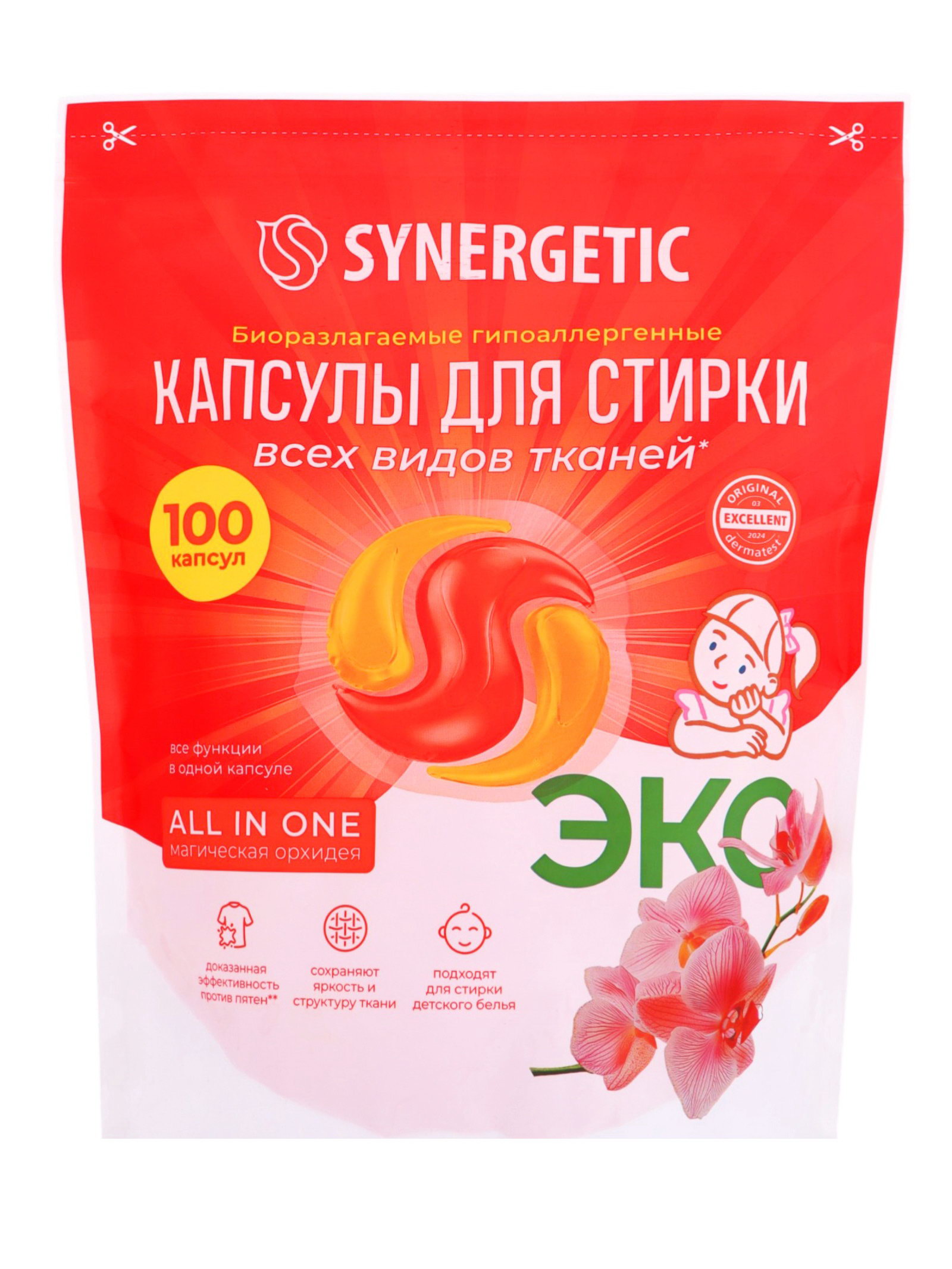 Капсулы для стирки белья биоразлагаемые ALL IN ONE гипоаллергенные, 100 шт., Synergetic, Россия