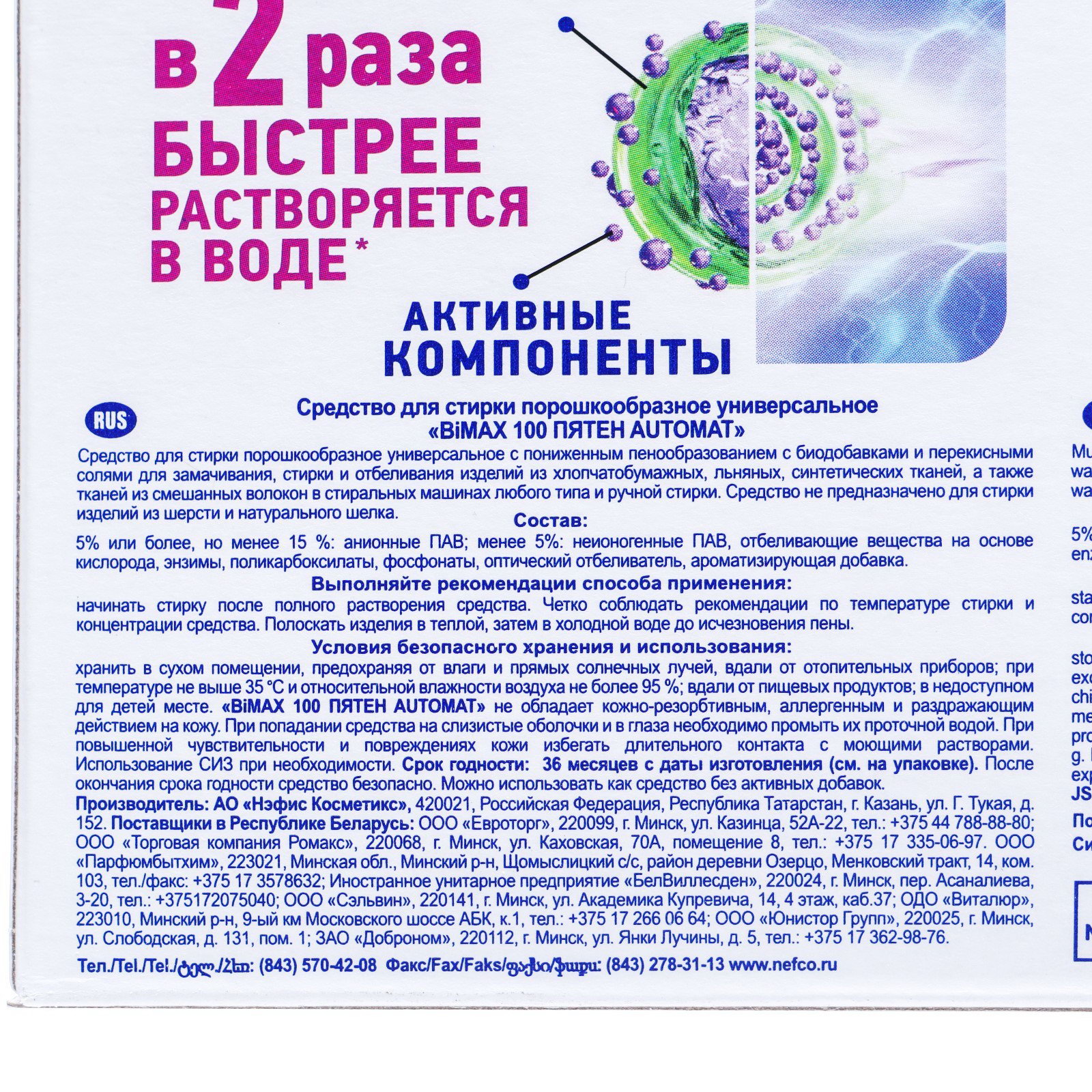 Стиральный порошок "100 пятен", автомат, 400 г, 14.5x3.5x20 см., BIMAX, Россия