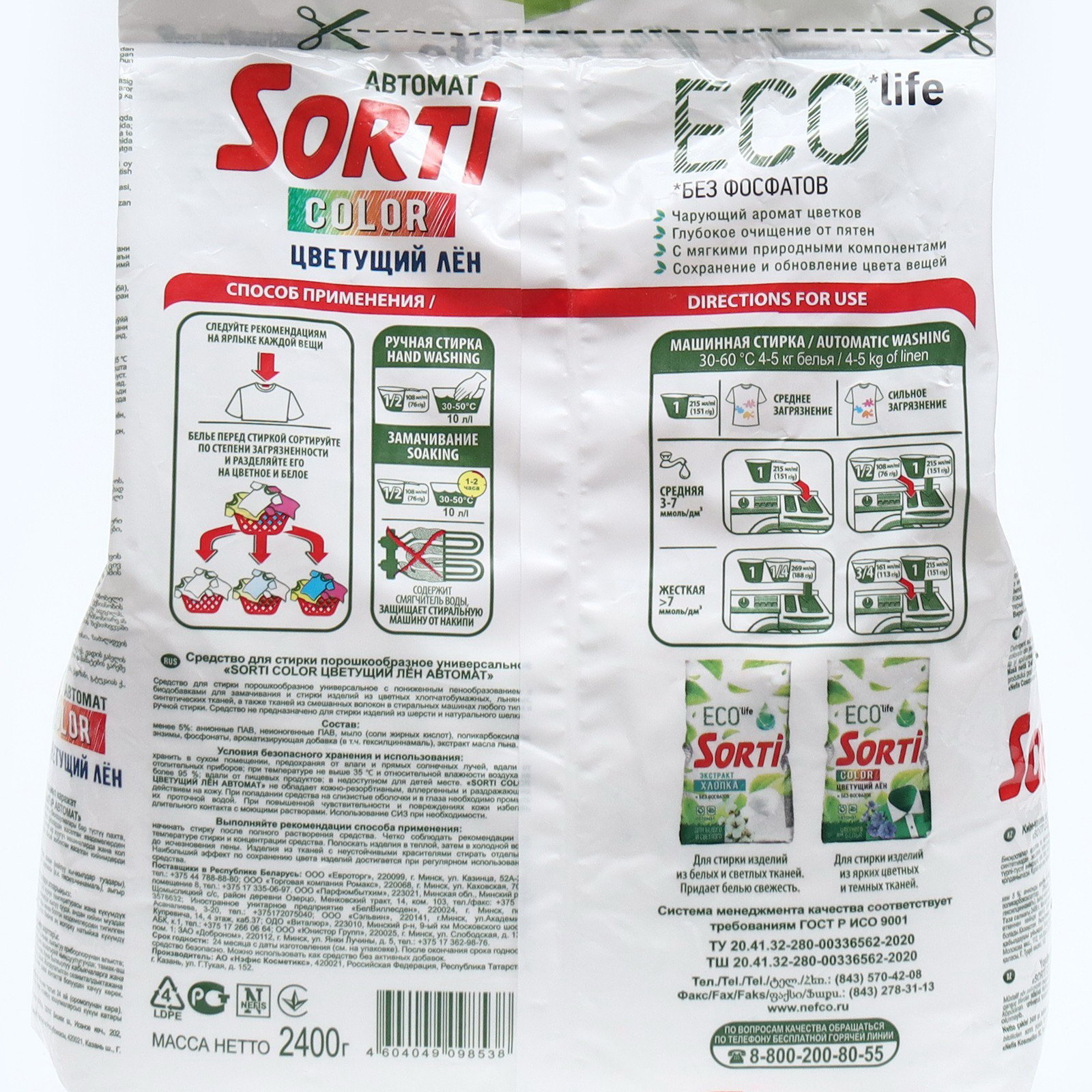 Размер упаковки: 4 x 29 x 20 см. tnved: 3402500000 Температурное ограничение: Нет Назначение: Для цветных тканей Вид стирки: Автомат Вес, кг: 2.4 Запрет реализации по сегментам: 00000000208 Стиральный порошок Sorti "Цветущий лен", автомат, 2.4 кг -Чарующий аромат цветков -Глубокое очищение от пятен -Сохранение и обновление цвета вещей -С мягкими природными компонентами Способ применения: На 4-5 кг загрязненного белья использовать 151 гр порошка при сильном и среднем загрязнение и средней жесткости воды и 188 гр при жесткой воде и 188 гр при жесткой воде. Состав:менее 5%: анионные ПАВ, неионогенные ПАВ, мыло (соли жирных кислот), поликарбоксилаты, энзимы, фосфонаты, ароматизирующая добавка (в т.ч. гексилциннамаль), экстракт масла льна. Меры предосторожности Использовать средство только по назначению. Хранить в недоступном для детей месте. Хранить вдали от пищевых продуктов. Хранить с закрытой крышкой. Хранить в сухом, прохладном и темном месте. Условия хранения: Хранить в сухом помещении, предохраняя от влаги и прямых солнечных лучей, вдали от отопительных приборов; при температуре не выше 35 ?С и относительной влажности воздуха не более 95 %; вдали от пищевых продуктов; в недоступном для детей месте. | ||
