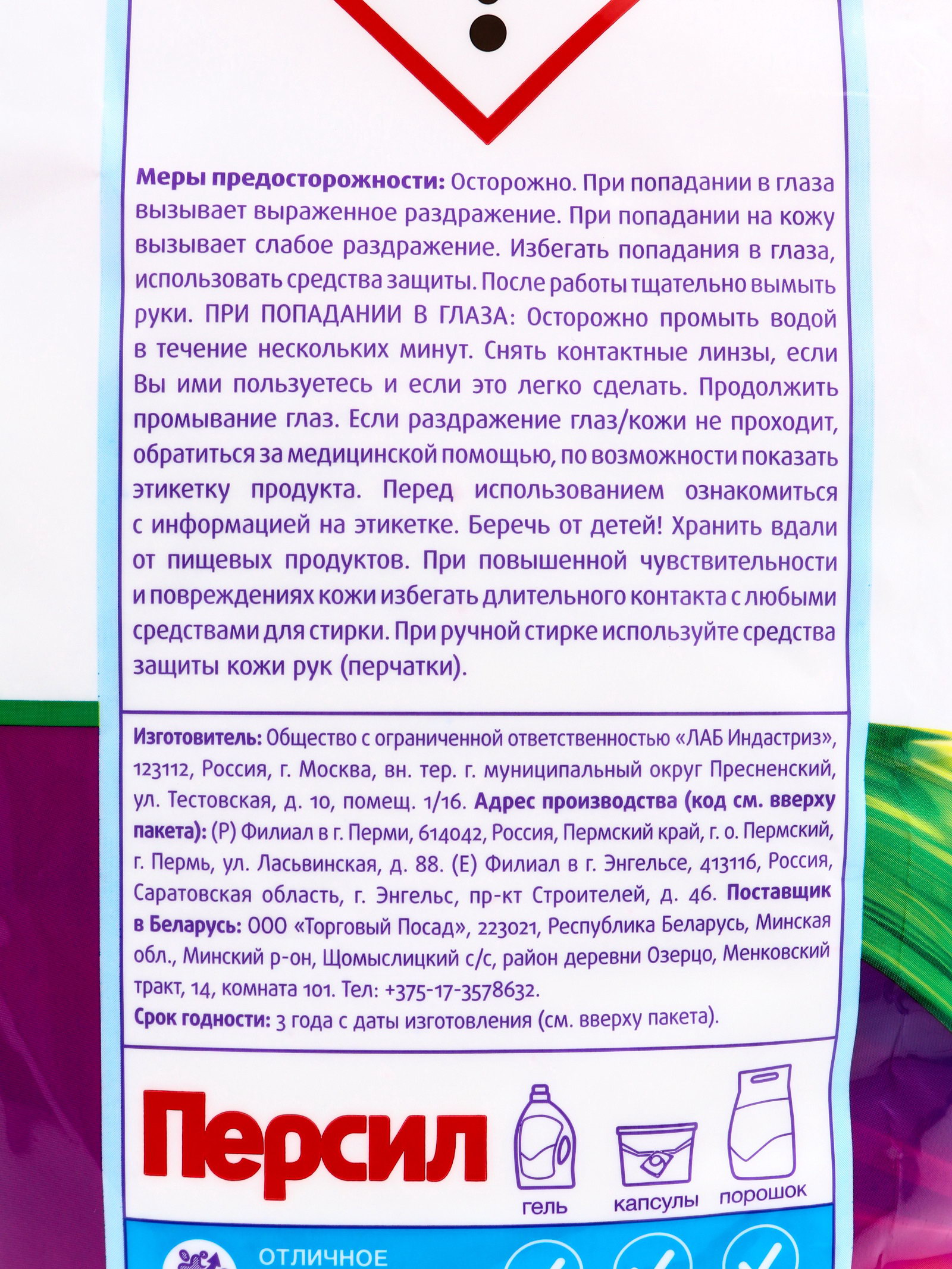 Размер упаковки: 26 x 9 x 39 см. Запрет реализации по сегментам: 00000000208 Температурное ограничение: Нет Вид стирки: Для всех видов стирки Назначение: Для цветных тканей Вес, кг: 8 Вес, кг: 8 tnved: 3402209000 Порошок для стирки Персил Color Свежесть от Вернель: -Удаляет самые различные пятна -Заботится о ткани и возвращает вещам яркость красок -Дарит вещам свежий аромат от Вернель, который сохраняется надолго -Подходит для стирки цветных изделий из хлопчатобумажных, льняных, синтетических тканей и тканей из смешанных волокон в стиральных машинах-автоматах и ручной стирки в воде любой жесткости -Обеспечивает защиту от образования известкового налета для жесткой и мягкой воды -Не содержит фосфатов и хлорного отбеливателя -100 % перерабатываемая упаковка Способ применения:Следуйте рекомендациям, указанным на ярлыках одежды и в паспорте стиральной машины, при выборе режима стирки и температуры. Изделия из тканей с неустойчивыми красителями стирайте отдельно. При ручной стирке перед загрузкой белья полностью растворите порошок в воде, после стирки несколько раз прополощите изделие в теплой, а затем в холодной воде до исчезновения пены. Рекомендованная дозировка при стирке 4-5 кг белья в воде мягкой или средней жесткости: 190 мл = 150 гр Осторожно. При попадании в глаза вызывает выраженное раздражение глаз. Избегать попадания в глаза, использовать средства защиты. После работы тщательно вымыть руки. При попадании в глаза: осторожно промыть водой в течение нескольких минут. Снять контактные линзы, если Вы ими пользуетесь и если это легко сделать. Продолжить промывание глаз. Если раздражение глаз не проходит, обратиться за медицинской помощью, по возможности показать этикетку продукта. Перед использованием ознакомиться с информацией на этикетке. Беречь от детей! Хранить вдали от пищевых продуктов. При повышенной чувствительности и повреждениях кожи избегать длительного контакта с любыми средствами для стирки. При ручной стирке используйте средства защиты рук (перчатки). Состав:5-15 % анионных ПАВ; <5 % неионогенных ПАВ, поликарбоксилатов, фосфонатов, мыла, энзимов, отдушки. | ||