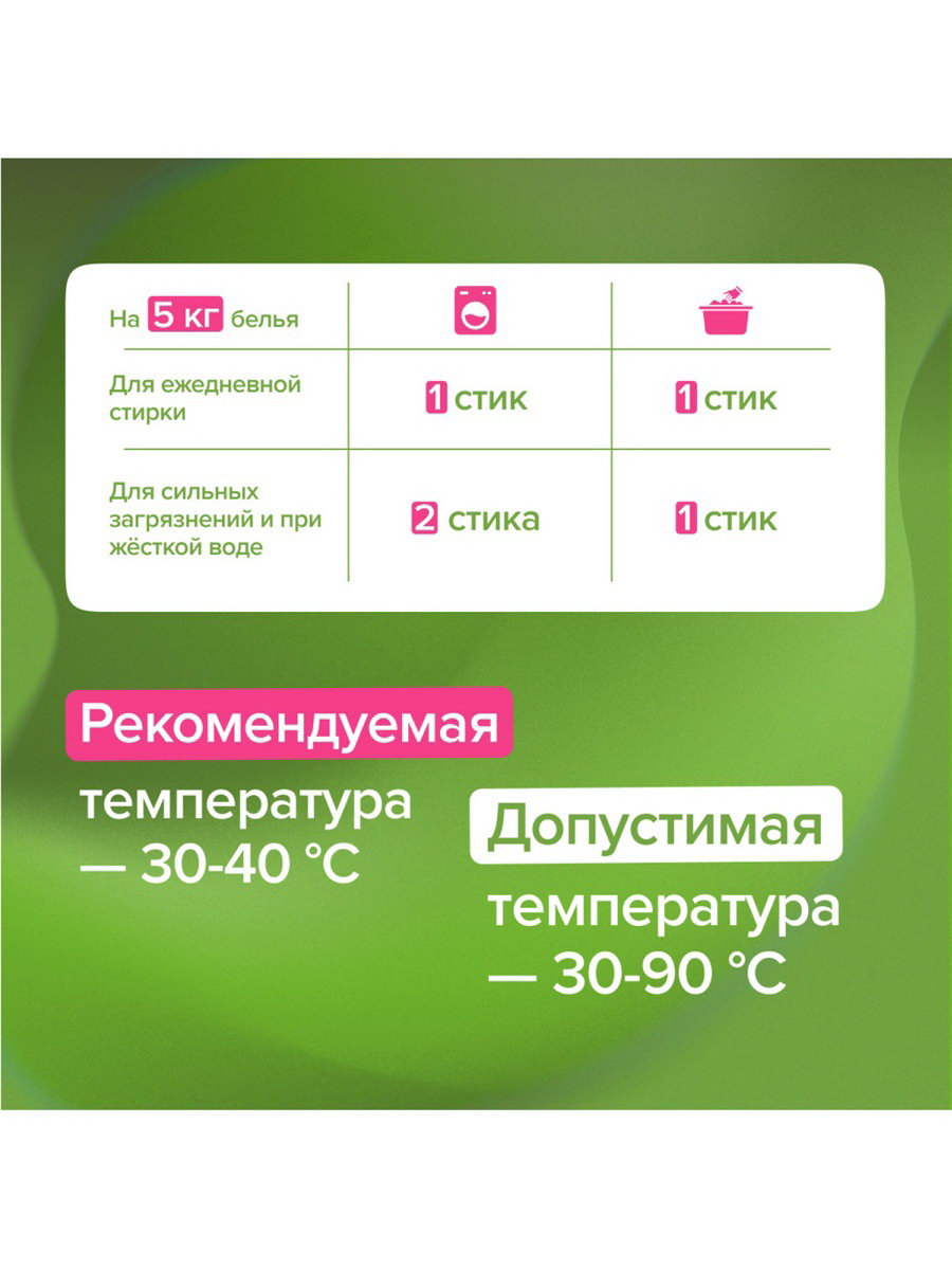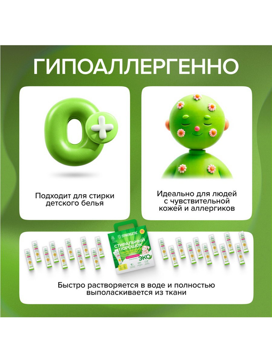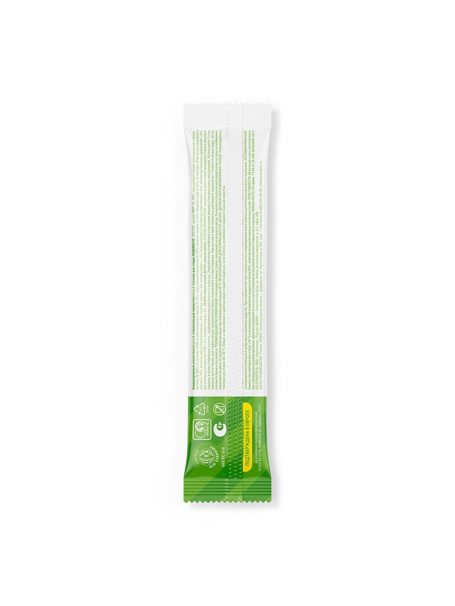 Размер упаковки: 21 x 22.5 x 17 см. tnved: 3402500000 tnved: 3402500000 Ароматизированные: Да Антибактериальное: Нет Вид средства: Порошок Температурное ограничение: Нет Назначение: Для всех видов тканей Вес, г/Объём, мл: 2500 Запрет реализации по сегментам: 00000000208 Стиральный порошок SYNERGETIC - экологичный, безопасный, универсальный, гипоаллергенный и эффективный суперконцентрат в стиках. Биоразлагаемый порошок создан на основе безопасных растительных компонентов, не вызывает раздражения кожи, аллергии, не оставляет запаха и подходит для стирки детского белья 0+ и одежды людей с чувствительной кожей. Подходит для белого и цветного белья из натуральных и синтетических тканей, для ручной и машинной стирки. Комбинация пяти видов энзимов, растительных ПАВ и натурального мыла эффективно удаляет загрязнения с волокон ткани даже в холодной воде и при коротких циклах стирки. Уникальный комплекс зеленых хелатов помогает устранить инкрустацию (посерение): естественный белый цвет возвращается к вещам уже после нескольких стирок. Стиральный порошок быстро растворяется в воде и не остается в одежде, полностью выполаскивается из волокон ткани. Экономичный и практичный формат стика удобен не только при использовании дома, но и для путешествий любым видом транспорта. Аккуратно оторвите край бумажного стика и засыпьте порошок в отсек стиральной машины, предназначенный для моющего средства. Закройте отсек и включите стиральную машину в соответствии с инструкцией. Используйте 1 стик порошка на 5 кг белья, для стирки сильно загрязнённого белья используйте 2 стика порошка. При ручной стирке полностью растворите порошок из 1 стика в 5 литрах воды, затем положите бельё и постирайте. Соблюдайте режим стирки, указанный на ярлыке изделия. Не наносите порошок непосредственно на ткань во избежание изменения её цвета. Стирайте цветные вещи при температуре не выше 40 ℃. Не используйте для стирки шерсти, шелка, деликатных и мембранных тканей. Рекомендуемая температура стирки 30 - 40 ℃. Новые, а также белые и цветные вещи стирайте отдельно, если степень устойчивости окраски ткани не известна. Беречь от детей. При попадании средства в глаза промыть водой. Использовать строго по назначению. Подготовленная вода > 30%; комплекс К-тензидов (растительного происхождения) 5–15%; гидрофилизирующий растительный полимер < 5%; растительный полимер < 5%; бензоат натрия < 5%; гипоаллергенная парфюмерная композиция с эфирными маслами < 5%; растительные энзимы без ГМО < 5%. | ||