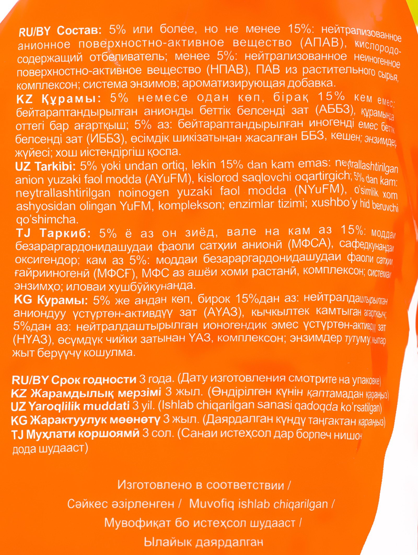 Размер упаковки: 16 x 7 x 26 см. tnved: 3402500000 Запрет реализации по сегментам: 00000000208 Температурное ограничение: Нет Назначение: Для всех видов тканей Вес, г/Объём, мл: 3000 | ||