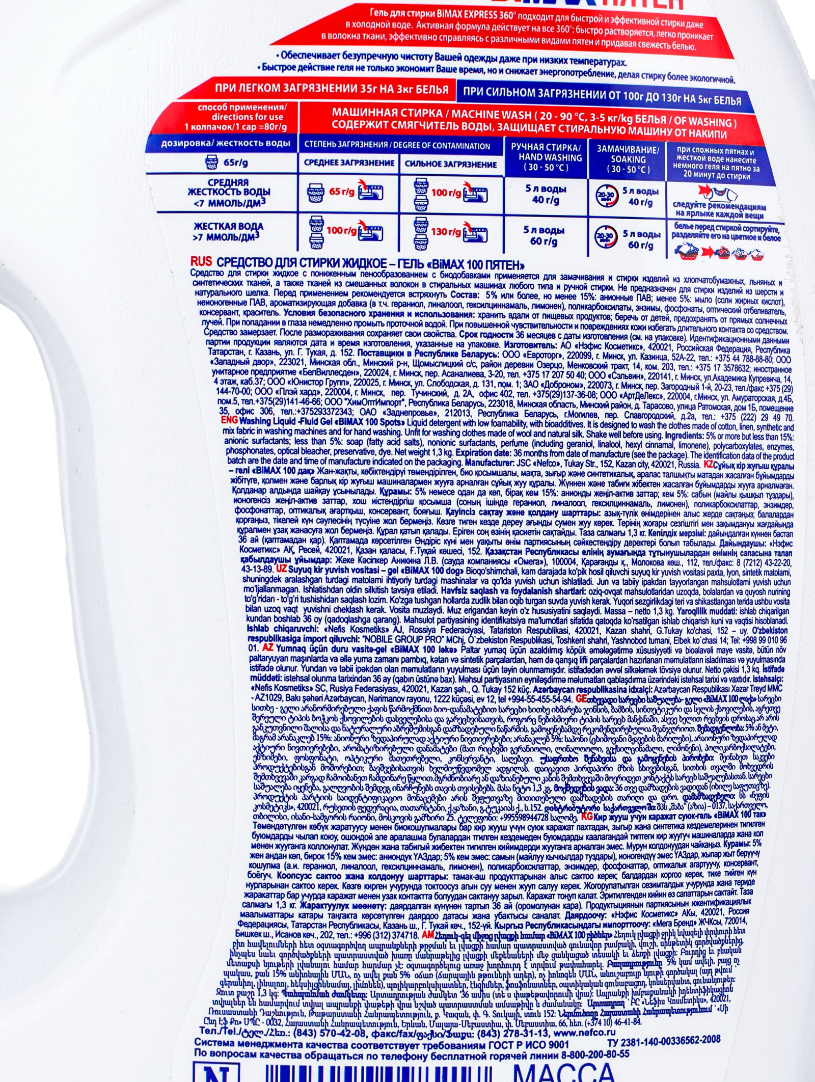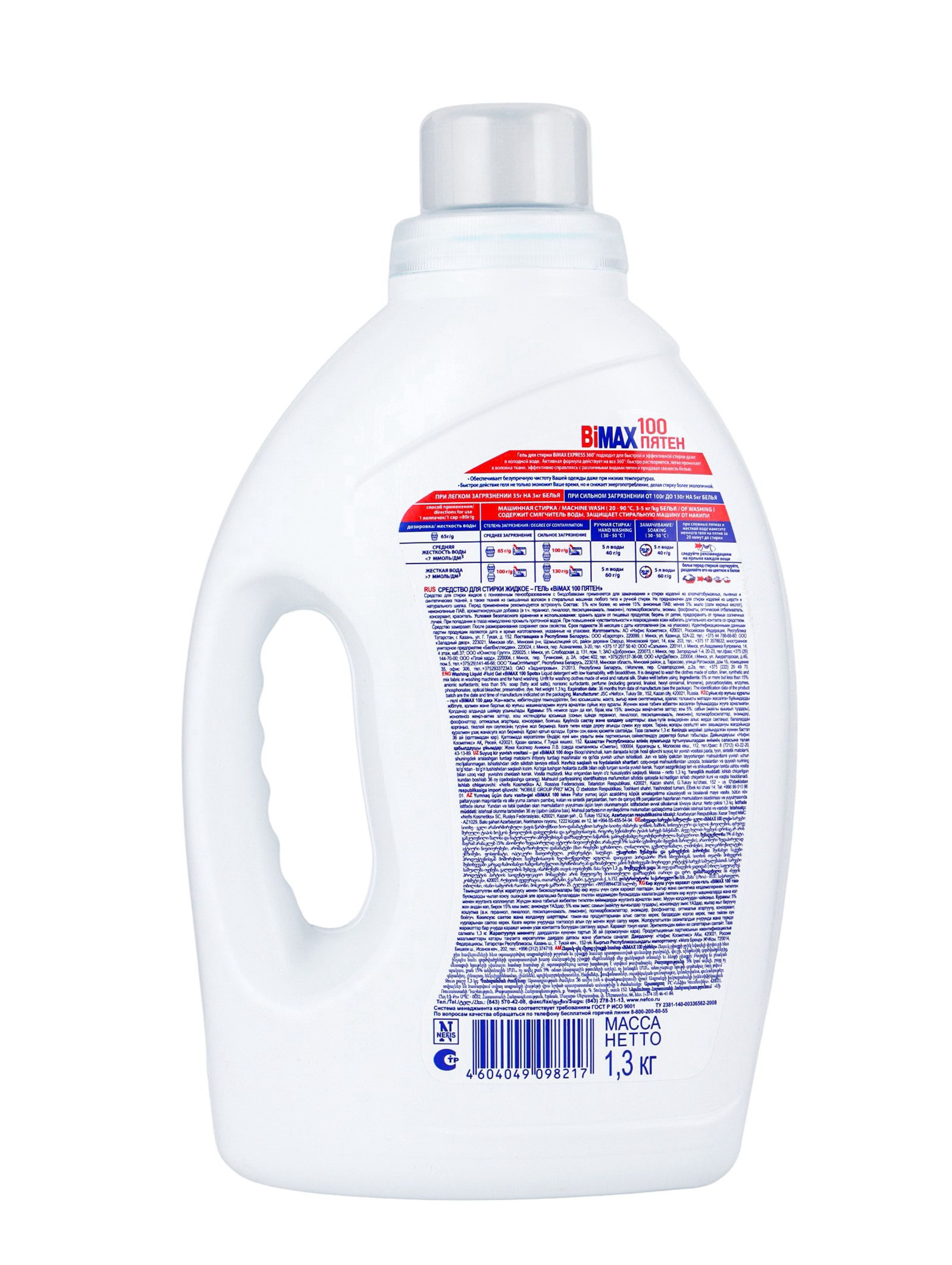 Жидкое средство для стирки "100 пятен", гель, универсальное, 1.3 л, 1300 мл., BIMAX, Россия