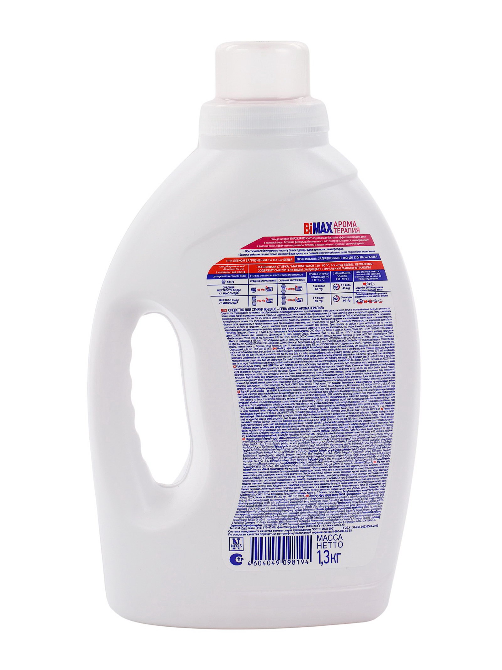 Размер упаковки: 7 x 28 x 14 см. tnved: 3402209000 Температурное ограничение: Нет Температурное ограничение: Нет Вид стирки: Для всех видов стирки Назначение: Для всех видов тканей Запрет реализации по сегментам: 00000000208 Жидкое средство для стирки BiMax "Арома Терапия", гель, универсальное, 1.3 л -Новая активная концентрированная формула эффективно справляется с пятнами, защищает волокна ткани и дарит приятный, нежный аромат. -Гель-концентрат, заменяет 3 кг стандартного неконцентрированного порошка -Безупречная чистота и мягкий аромат цветочной свежести Способ применения: При среднем загрязнение берем 65 г порошка, при сильном загрязнение 100 г порошка.( средняя жесткость воды). Ручная стирка берем 5 л воды и 40 гр порошка. При среднем загрязнение берем 100г порошка и сильном загрязнение 130 г порошка. ( жесткая вода). Ручная стирка берем 5 л воды и 60 гр порошка. Состав:5 % или более, но менее 15%: анионные ПАВ; менее 5%: неионогенные ПАВ, мыло (соли жирных кислот), фосфонаты, энзимы, ароматизирующая добавка (в т.ч. гераниол, бутилфенил метилпропиональ, цитронеллол), консервант, оптический отбеливатель, краситель. Меры предосторожности Использовать средство только по назначению. Хранить в недоступном для детей месте. Хранить вдали от пищевых продуктов. Хранить с закрытой крышкой. Хранить в сухом, прохладном и темном месте. Условия хранения: Хранить вдали от пищевых продуктов; беречь от детей, предохранять от прямых солнечных лучей. При попадании в глаза немедленно промыть проточной водой. При повышенной чувствительности и повреждениях кожи избегать длительного контакта со средством. Средство замерзает. После размораживания сохраняет свои свойства. | ||