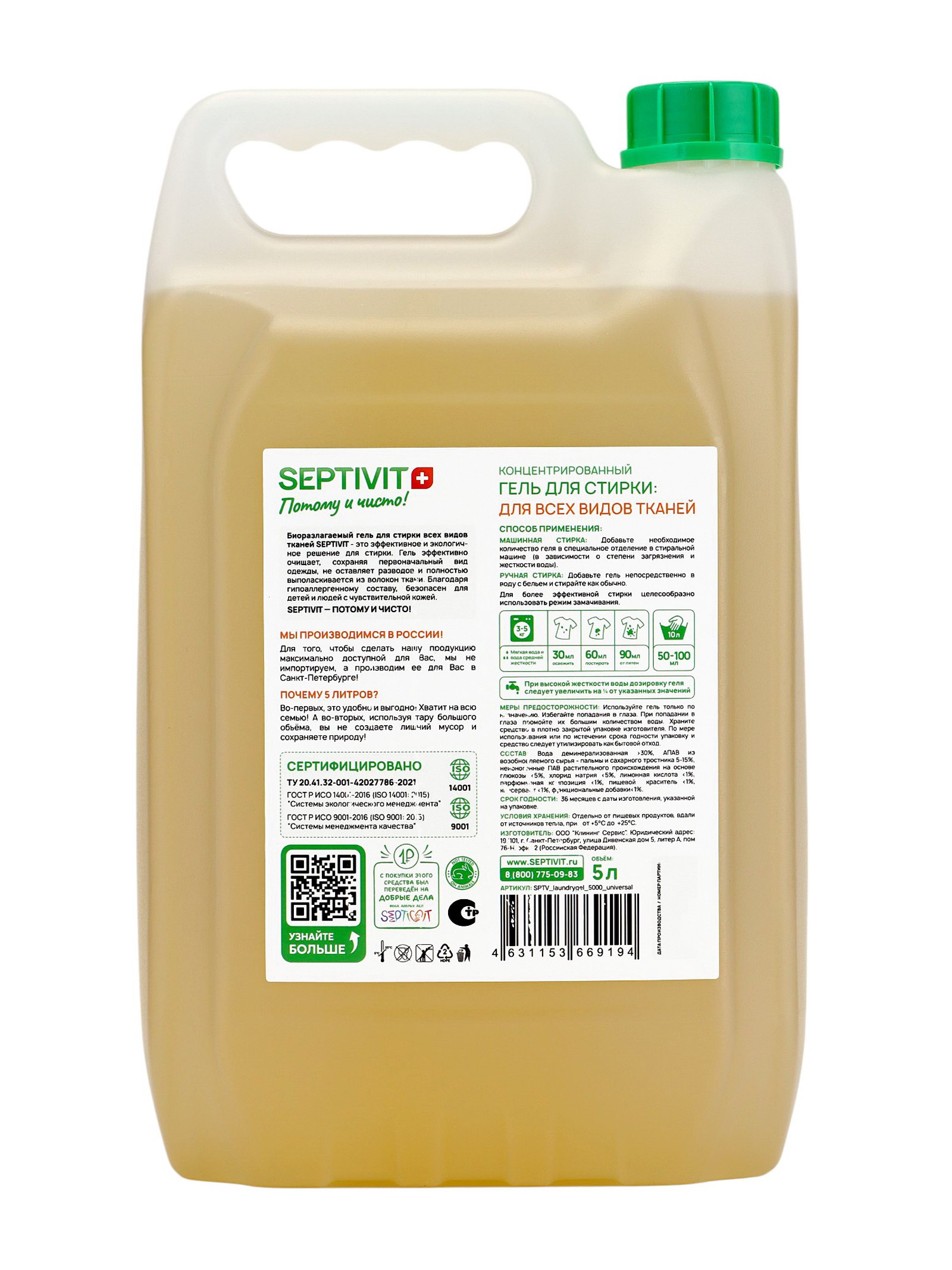 Размер упаковки: 13.5 x 28 x 19 см. Размер упаковки: 13.5 x 28 x 19 см. tnved: 3402500000 Вес/Объём: 5 л Ароматизированные: Да Антибактериальное: Нет Вид средства: Гель Температурное ограничение: Нет Вес, г/Объём, мл: 5000 Назначение: Для всех видов тканей Форма выпуска: Жидкость Вид стирки: Для всех видов стирки Особенности средства: Экосредство Запрет реализации по сегментам: 00000000208 Гель для стирки SEPTIVIT Premium - удобная и эффективная формула для стирки белья. Жидкий порошок для стирки обеспечивает бережный уход за вещами, не оставляя разводов и сохраняя первоначальный вид ткани. Экологичный, гипоаллергенный состав подходит для людей с чувствительной кожей, ведь средство полностью вымывается из волокон ткани, а на одежде не остается запаха отдушки. Гель для стирки белья можно использовать для ручной и машинной стирки. Продуманная линейка средств, позволит каждому найти "свое" идеальное средство для стирки. Septivit Premium - ЭКО-решения для Вашего дома! Состав: вода деминерализованная >·30 % ПАВ из возобновляемого сырья - пальмы и сахарного тросника 5-15%, неиногенные ПАВ растительного происхождения на основе глюкозы <5%, хлорид натрия <5%, лимонная кислота <1%, парфюмерная композиция <1%, пищевой краситель <1%, консервант <1%. функциональные добавки <1%. | ||