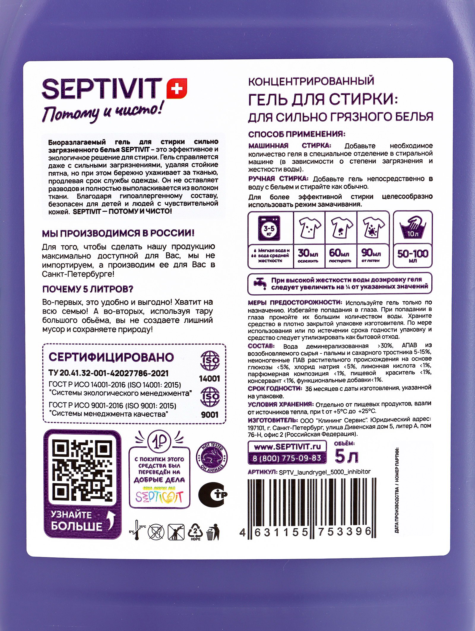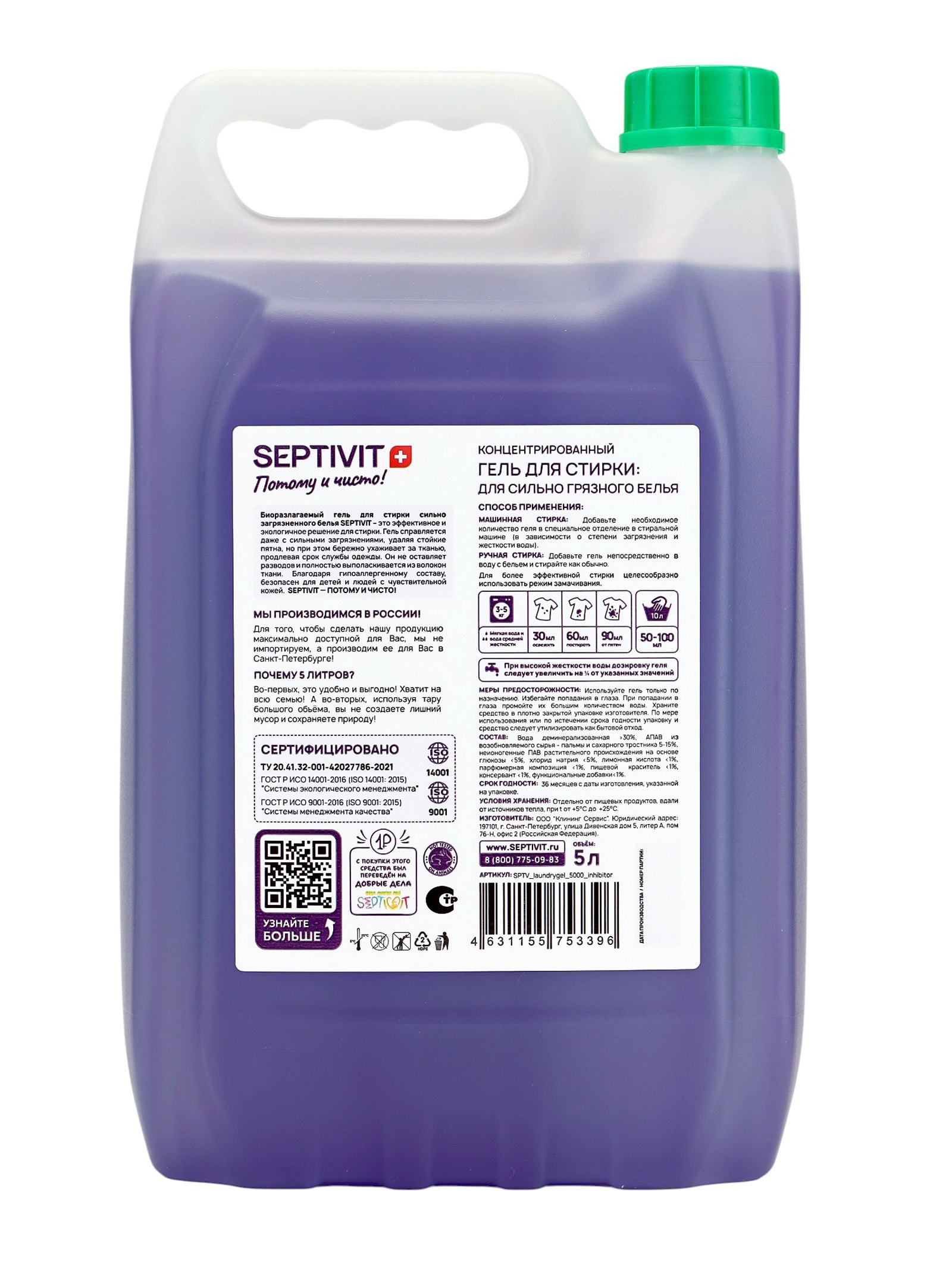Гель для стирки "Сильнозагрязненные вещи", 5 л, 5000 мл., SEPTIVIT, Россия