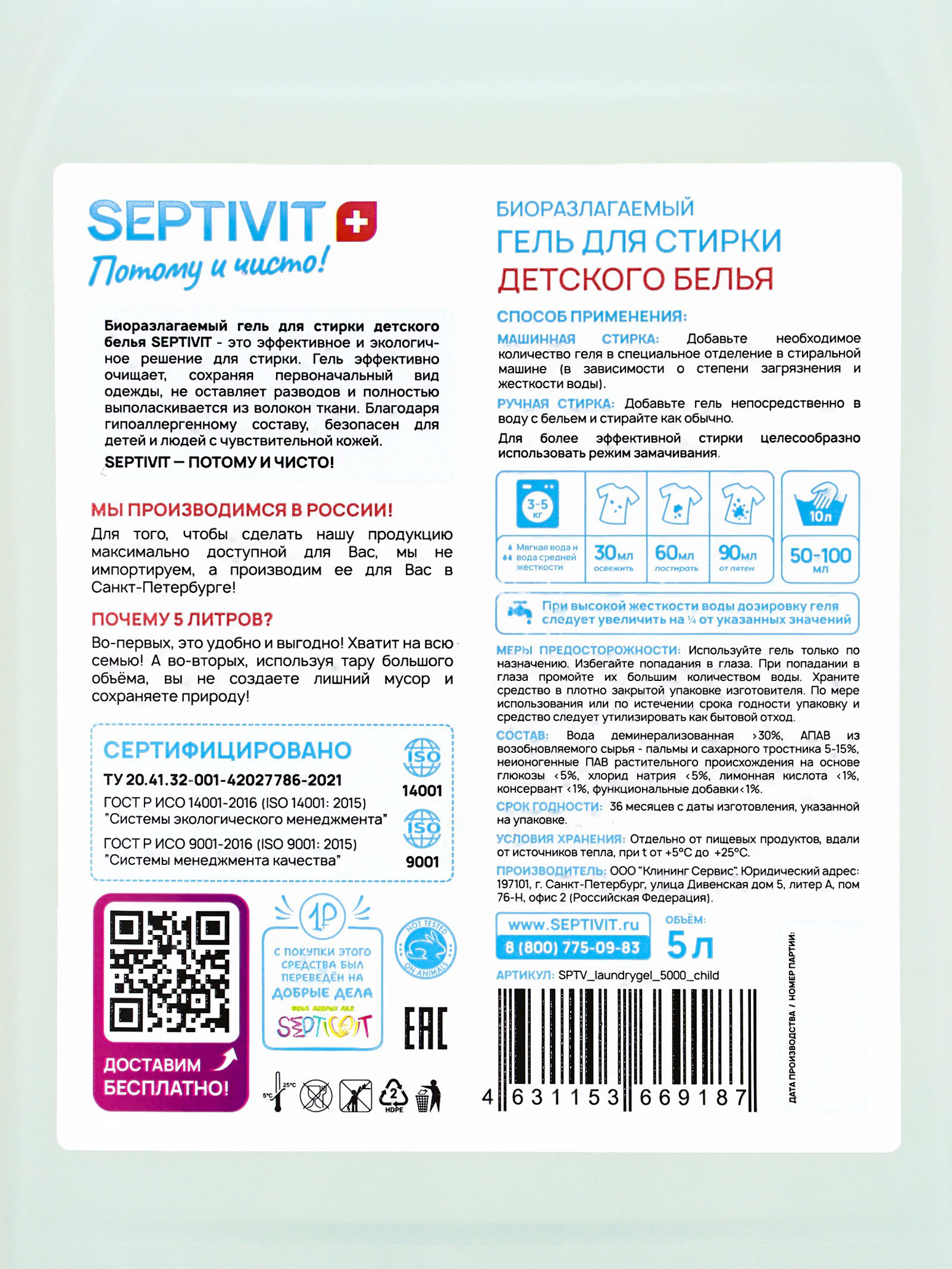 Гель для стирки для детское белья, 5 л, 5000 мл., SEPTIVIT, Россия