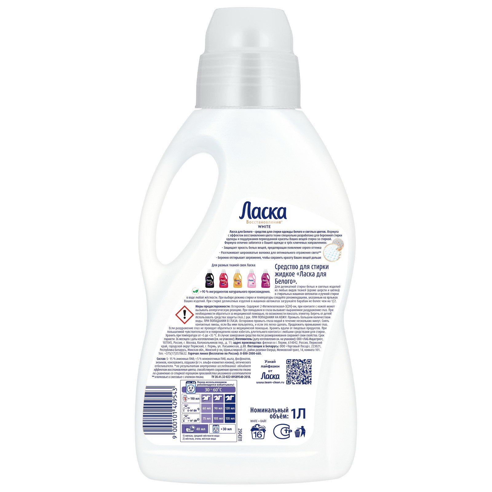 Гель Ласка удобен в использовании: дозируйте жидкое средство согласно инструкции, заливайте его в отделение для стирального порошка или добавьте мерный колпачок со средством для стирки в барабан стиральной машины. Способ применения: При выборе режима стирки и температуры следуйте рекомендациям, указанным на ярлыках Ваших изделий. При стирке деликатных изделий в машинах-автоматах загружайте барабан не более чем на 1/2. Стиральное средство Ласка просто использовать. Благодаря удобной крышке-дозатору Вы всегда будете знать, сколько геля необходимо добавить в отделение средств для стирки в стиральной машине или в воду при ручной стирке. Информация по дозировке стирального средства указана на обратной стороне упаковки. Осторожно. При попадании в глаза вызывает выраженное раздражение глаз. При необходимости обратиться за мед. помощью, по возможности показать этикетку. Беречь от детей! Использует средства защиты глаз/рук. ПРИ ПОПАДАНИИ НА КОЖУ: Промыть большим количеством воды. ПРИ ПОПАДАНИИ В ГЛАЗА: Осторожно промыть глаза водой в течении нескольких минут. Снять контактные линзы, если Вы ими пользуетесь. Продолжить промывание глаз. Если раздражение не проходит обратиться за медицинской помощью. Состав:55-15 % анионных ПАВ; < 5 % неионогенных ПАВ, мыла, фосфонатов, энзимов, консерванта, отдушки, оптического отбеливателя | ||