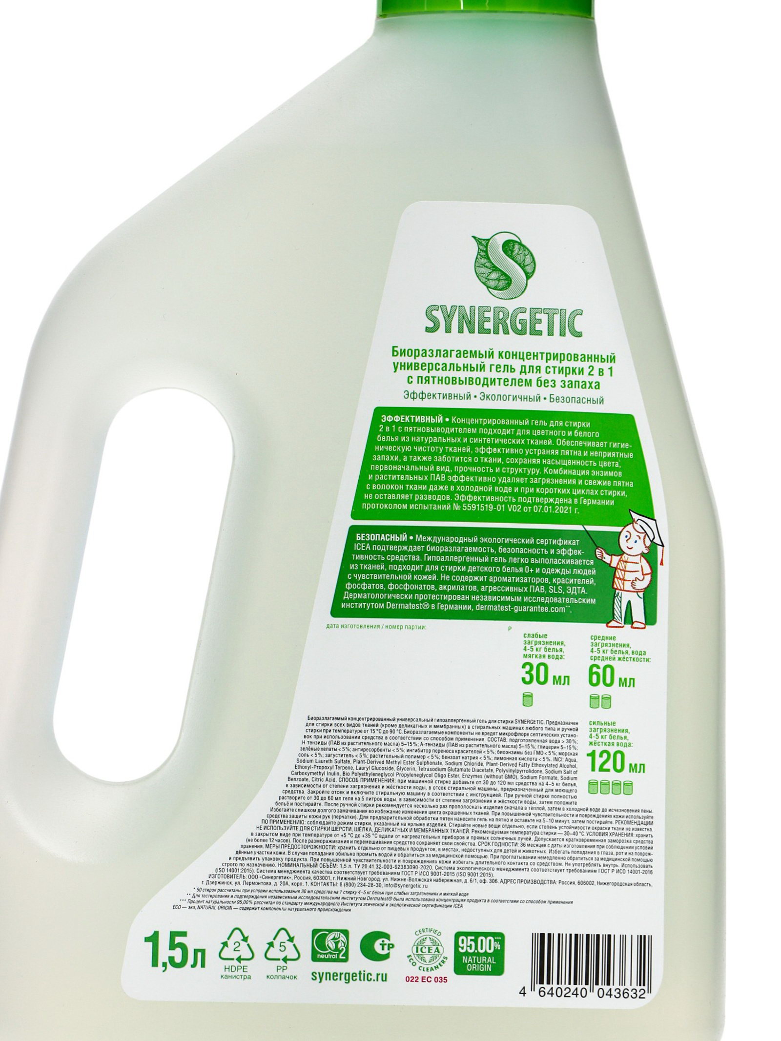 Гель для стирки 2 в 1, с пятновыводителем, 1.5 л, 1500 мл., Synergetic, Россия