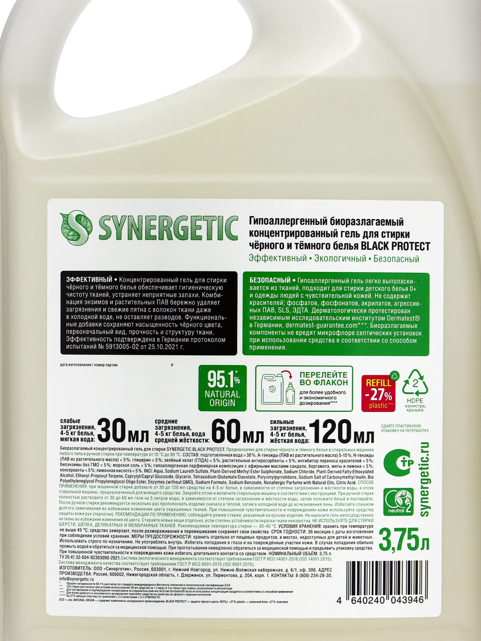 Гель для стирки Black protect, 3.75 л, 3750 мл., Synergetic, Россия