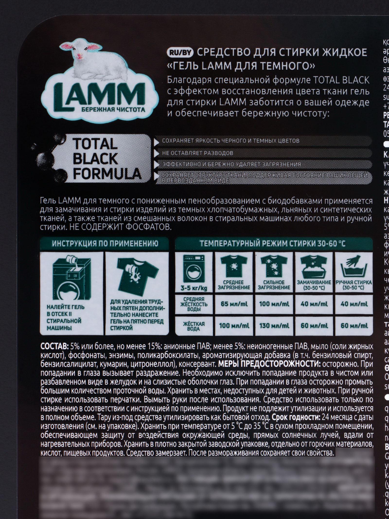 Применение Гель подходит для машинной и ручной стирки. Рекомендуется использовать средство согласно инструкции, дозируя его в зависимости от объёма белья и степени загрязнения. Для кого LAMM для тёмного создан для людей, которые ценят яркость и долговечность тёмной одежды. Средство идеально подходит для регулярного ухода за тёмными вещами, обеспечивая чистоту, свежесть и насыщенность цвета после каждой стирки. | ||