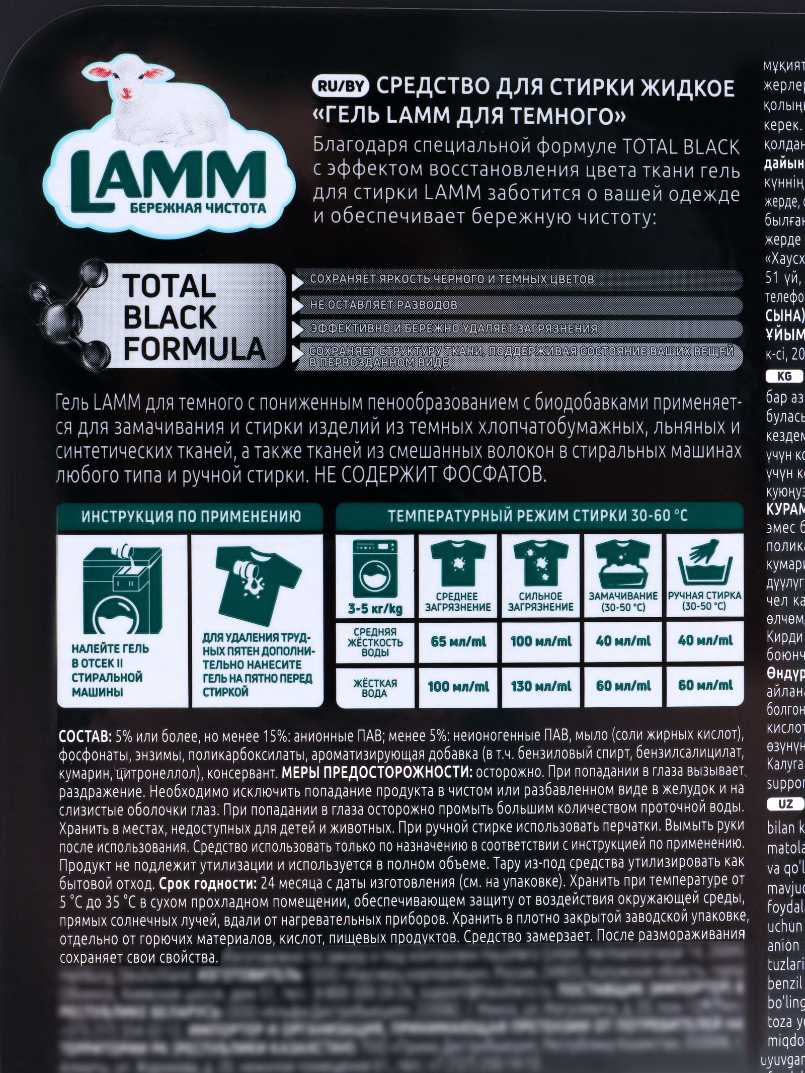 Применение Подходит для машинной и ручной стирки. Для оптимального результата рекомендуется следовать инструкции на упаковке, дозируя средство в зависимости от степени загрязнения и объёма белья. Для кого LAMM для тёмного создан для людей, которые ценят насыщенные цвета и долговечность своих вещей. Средство идеально подходит для ухода за тёмной одеждой и текстилем, обеспечивая чистоту, свежесть и яркость оттенков после каждой стирки. | ||