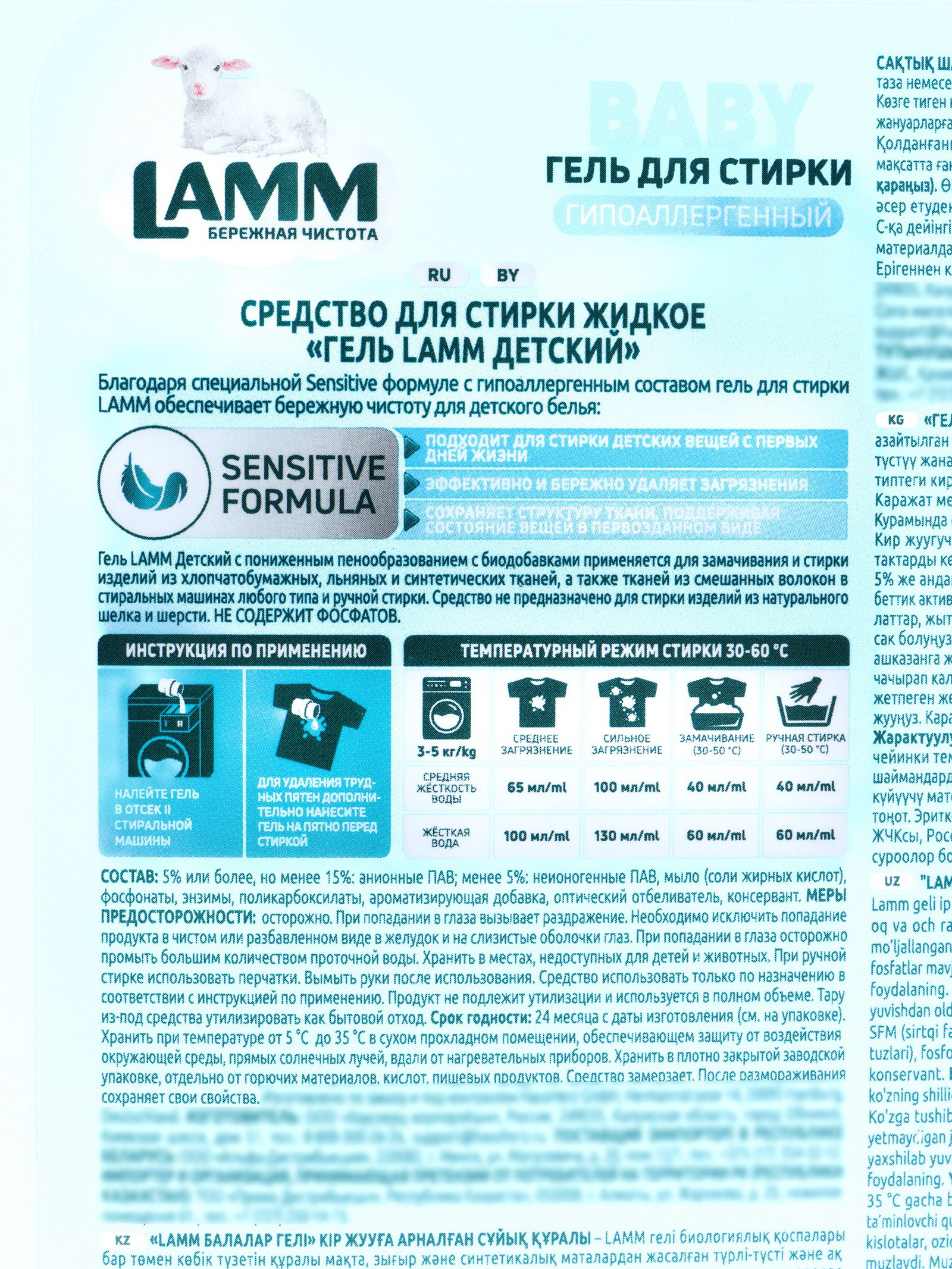 Аромат Гель для стирки LAMM Детский обладает нежным, свежим ароматом, который сохраняет бельё приятно пахнущим после стирки, не раздражая дыхательные пути и кожу ребёнка. Способ применения Для машинной стирки: