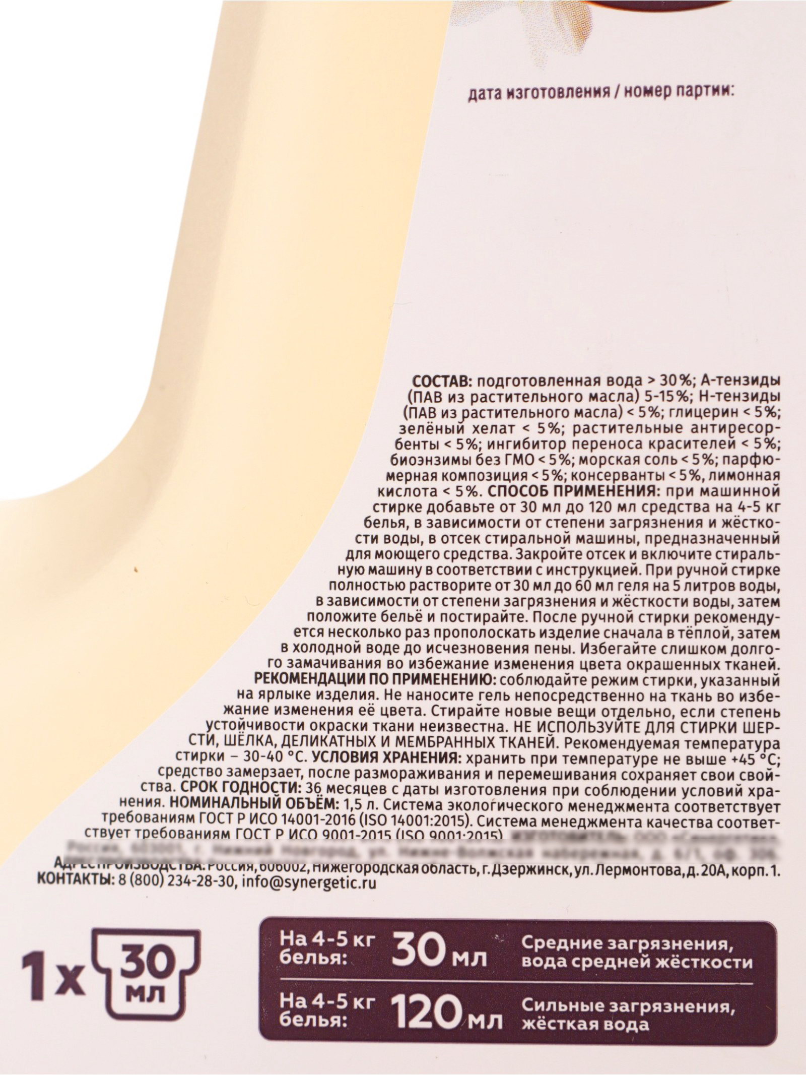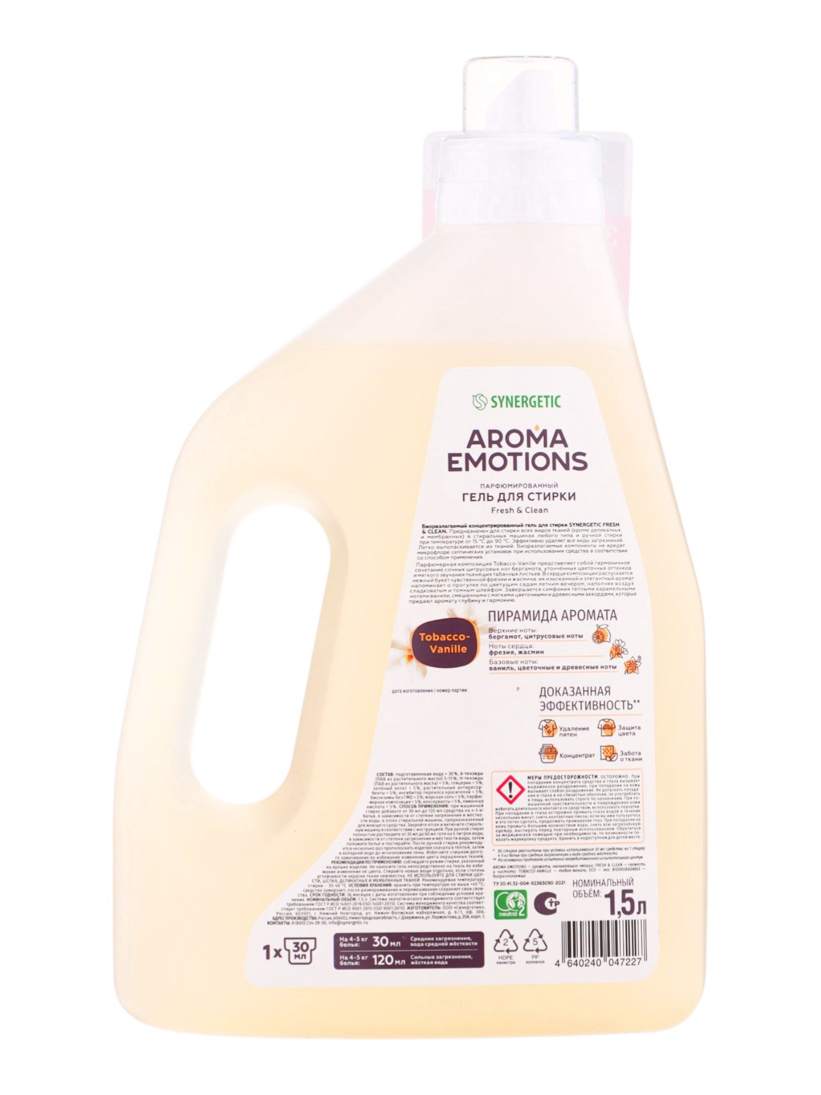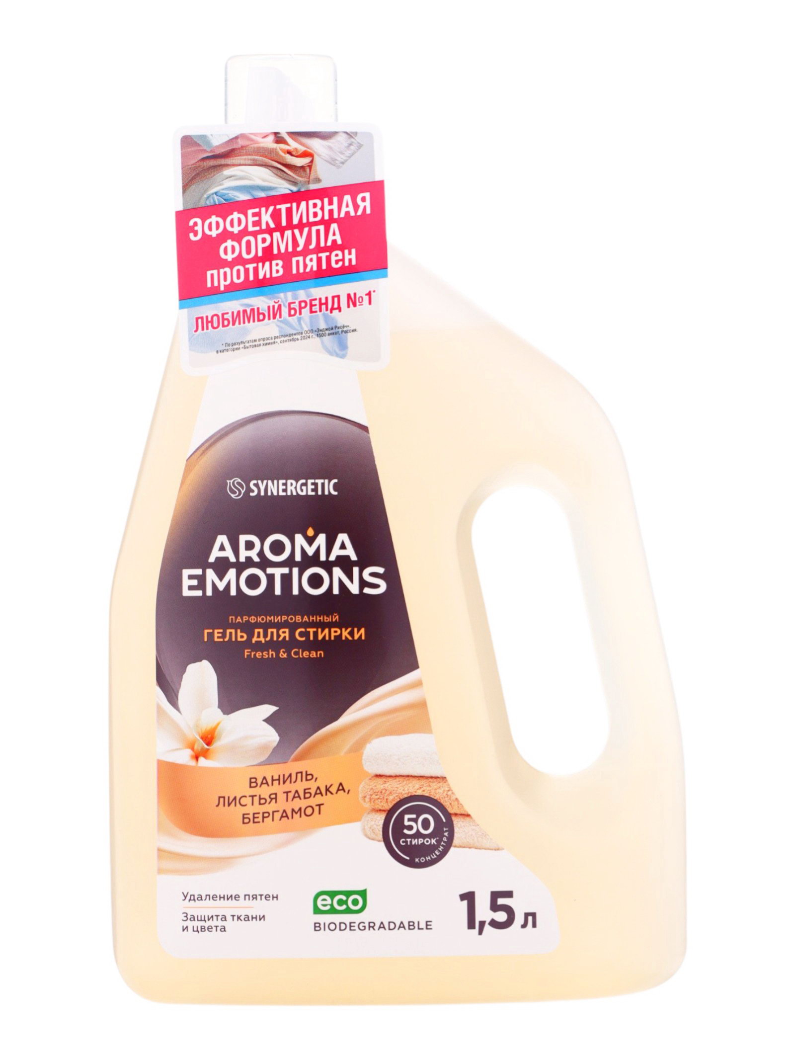 Гель для стирки белья парфюмированный ваниль, табак, бергамот, 1.5 л, 1500 мл., Synergetic, Россия