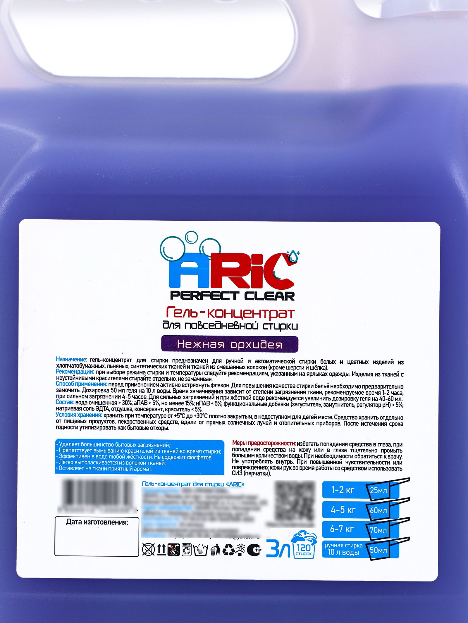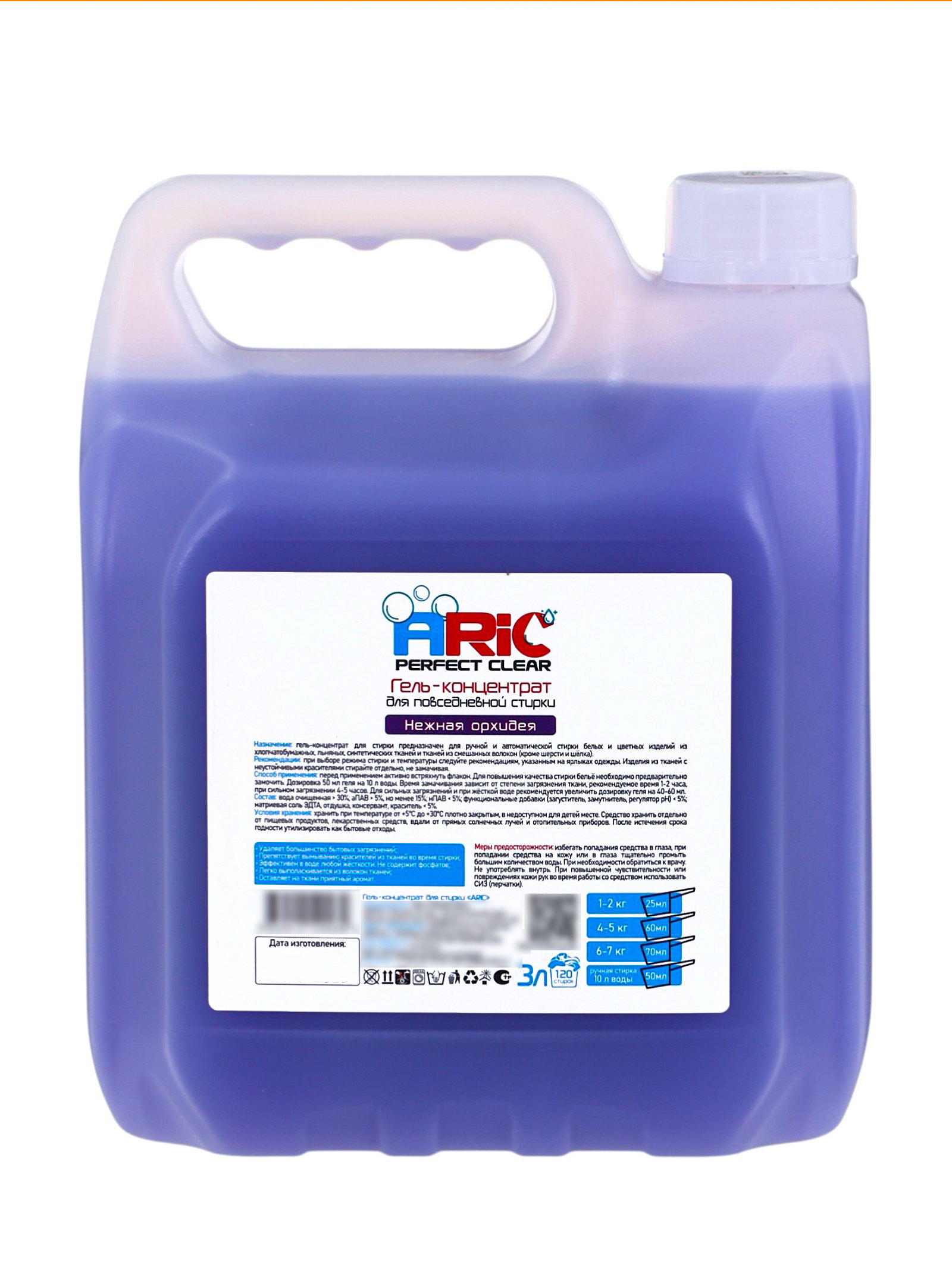 Вид стирки: Автомат, Для всех видов стирки, Ручная Размер упаковки: 11.5 x 21.5 x 17.5 см. tnved: 3402500000 Температурное ограничение: Нет Запрет реализации по сегментам: 00000000208 Вес, г/Объём, мл: 3000 Назначение: Для всех видов тканей Форма выпуска: Гель Особенности средства: Концентрат Гель для стирки ARIC "Нежная орхидея" в канистре объёмом 3 литра это универсальное средство для бережной и эффективной стирки одежды. Он разработан с учётом потребностей повседневного ухода за тканями, обеспечивая качественное удаление загрязнений и деликатное воздействие на волокна. Жидкая формула геля быстро растворяется в воде, глубоко проникает в структуру ткани и эффективно устраняет загрязнения различной степени сложности. Средство подходит для машинной и ручной стирки, работает при разных температурных режимах и не оставляет разводов на одежде. Гель помогает сохранить яркость цвета и форму изделий, снижает износ тканей и подходит для большинства типов материалов (за исключением требующих специального ухода). После стирки бельё приобретает мягкость и лёгкий цветочный аромат "нежной орхидеи", который остаётся ненавязчивым и приятным. Формат канистры обеспечивает экономичный расход и удобство хранения, делая средство оптимальным выбором для семьи и регулярного использования. Преимущества: