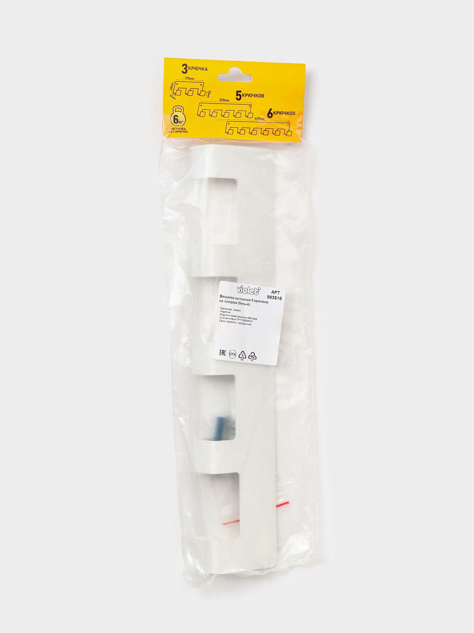 Размер упаковки: 6 x 3.5 x 32.5 см. tnved: 7323940000 Температурное ограничение: Нет Вид крепления: Шурупы Цвет: Белый Количество крючков: 5 С полочкой: Нет Оттенок: Белый Вид установки: Настенный (навесной) Белая настенная вешалка с пятью крючками лёгкое и практичное решение для хранения повседневных вещей. Её чистый белый цвет и минималистичная форма органично вписываются в светлые интерьеры: в прихожей она встречает гостей, в ванной держит полотенца, в спальне халат и сумку. Никакого визуального шума, только продуманная функциональность. Особенности