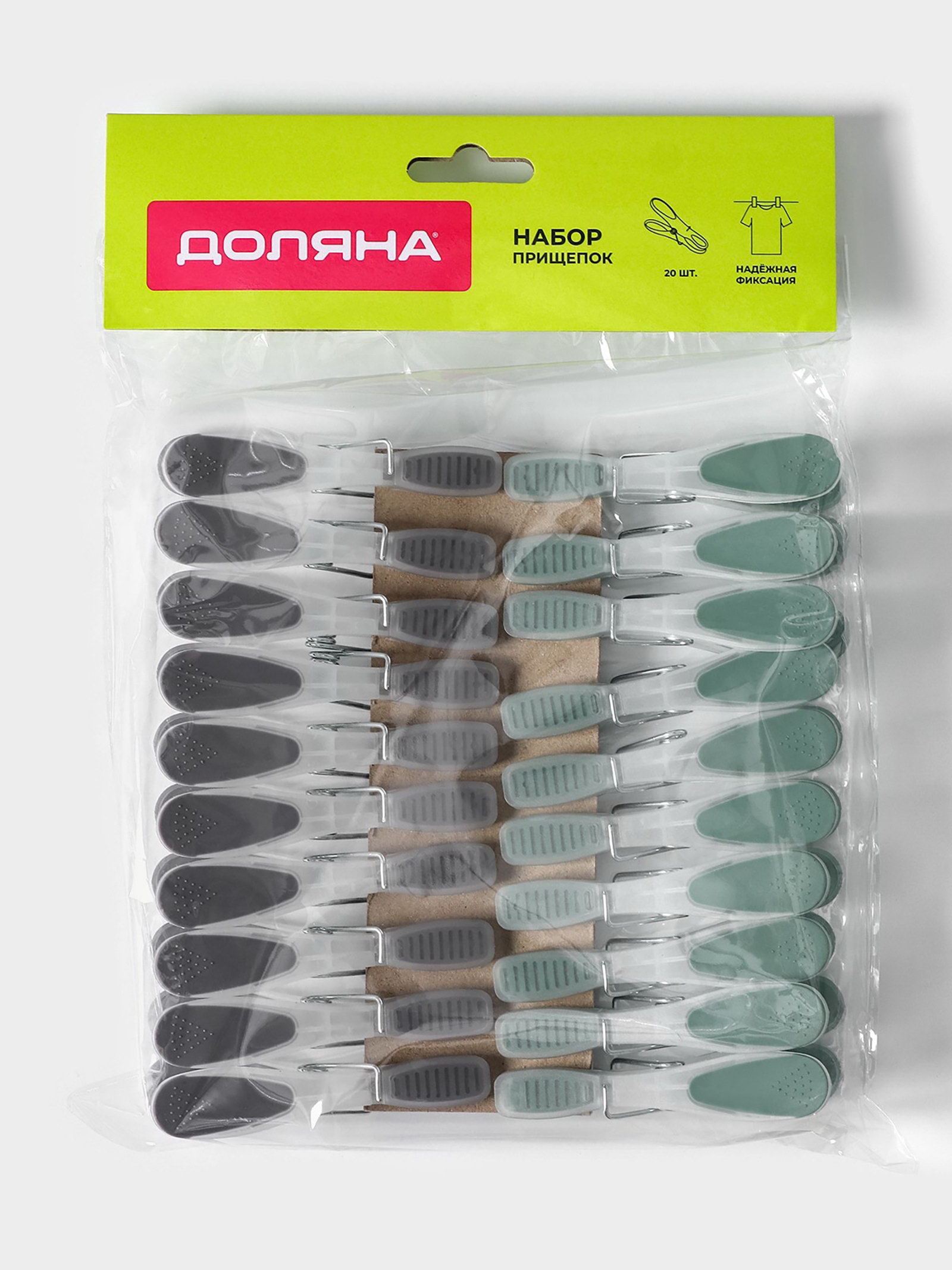 Набор прищепок бельевых 20 шт., пластик, 8.4x1.6 см, серо-зелёный, 1.6x8.4x3.5 см., Доляна, Китай