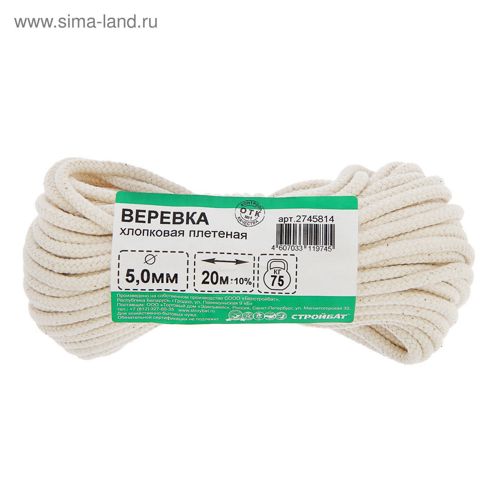 Веревка хлопковая плетеная 5.0 мм, 20 м, без покрытия, 50 см., Россия