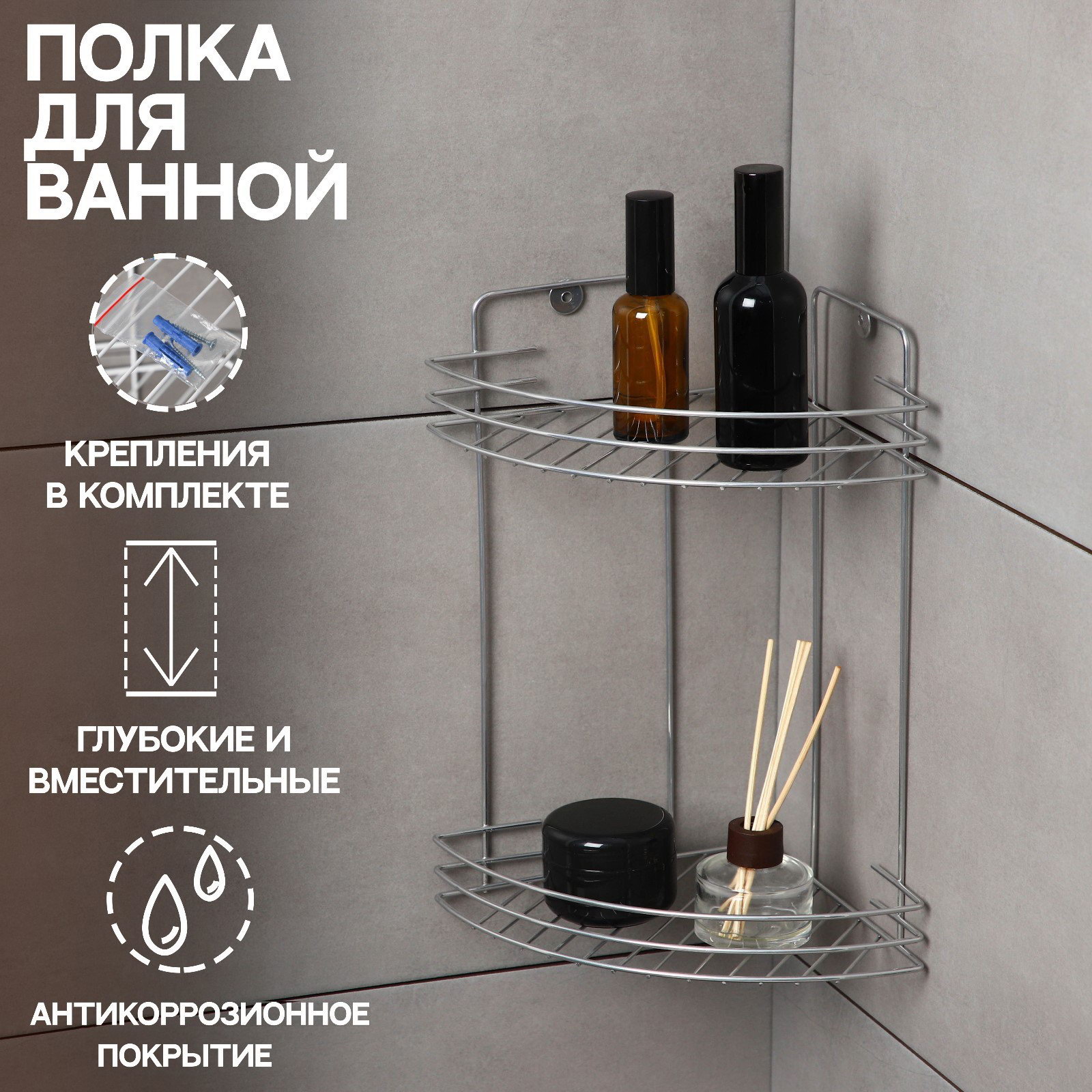 Размер упаковки: 19 x 31.5 x 19 см. Конструкция полки: Угловая Влагостойкость: Да tnved: 7323990000 Температурное ограничение: Нет Количество секций: 2 Цвет: Хромированный Крепления входят в комплект: Да Вид крепления: Подвесные Поставляется в разобранном виде: Нет Глубина, см: 19 Высота, см: 30 Угловая двухъярусная полка удобный и вместительный аксессуар для ванной комнаты. Подходит для хранения небольших полотенец, косметических и хозяйственных средств. Преимущества: