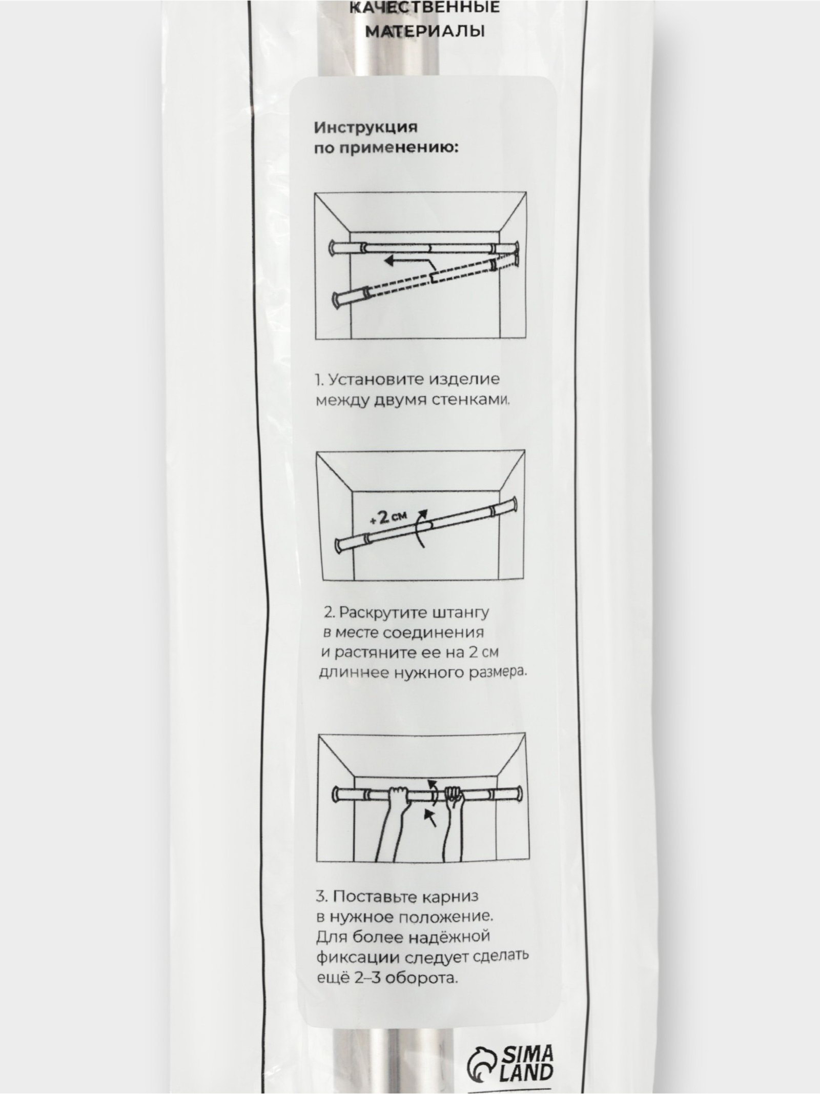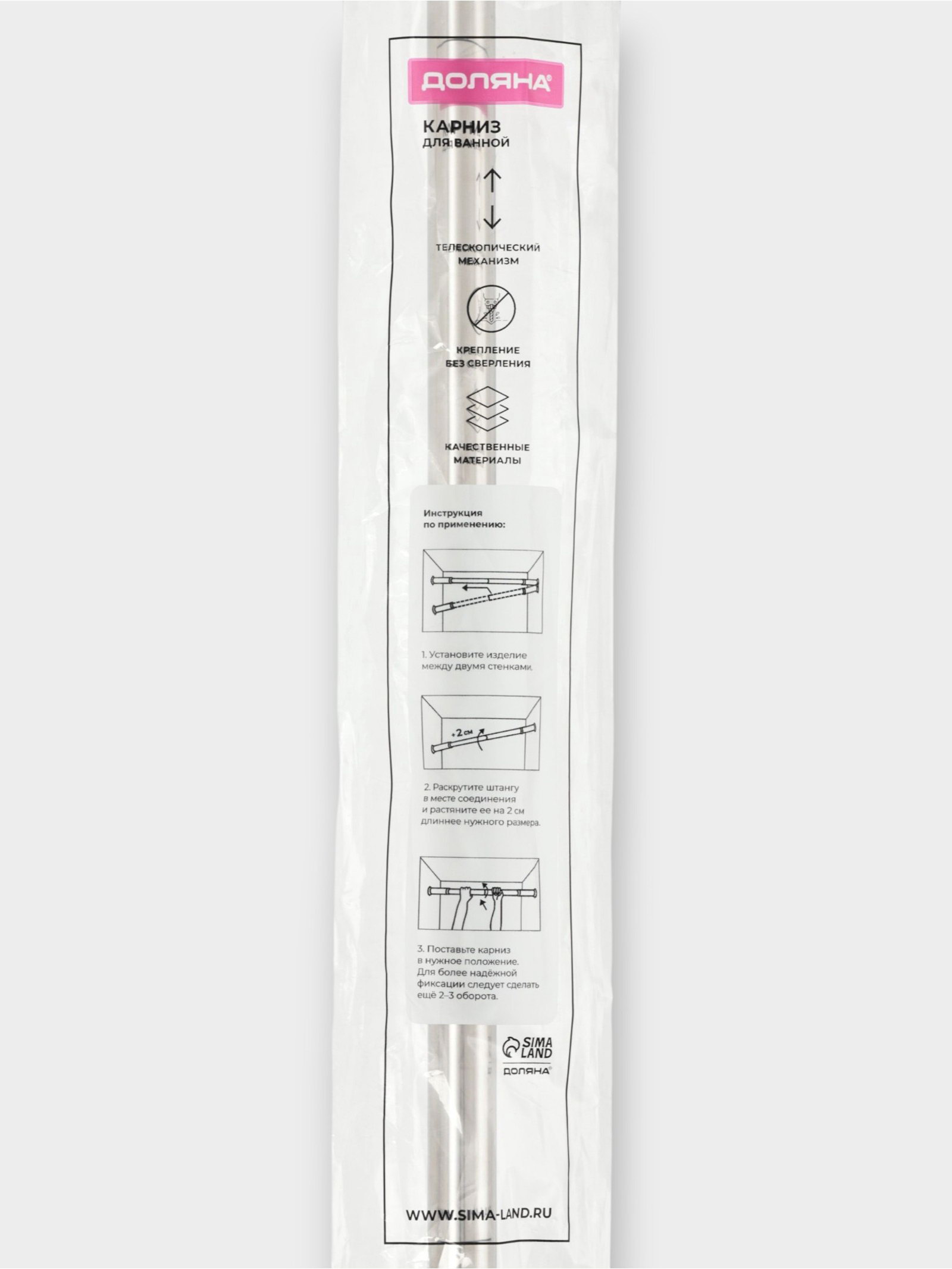Вид карниза: Прямой, Телескопический Длина, см: 116, 220 Размер упаковки: 7 x 5 x 117 см. tnved: 8302419000 Кольца в комплекте: Нет Цвет: Хромированный Телескопический карниз для ванной комнаты "Доляна" это удобное и практичное решение для установки шторы без сверления и повреждения стен. Конструкция позволяет быстро закрепить изделие в проёме и при необходимости так же легко снять или переставить. Основные преимущества
