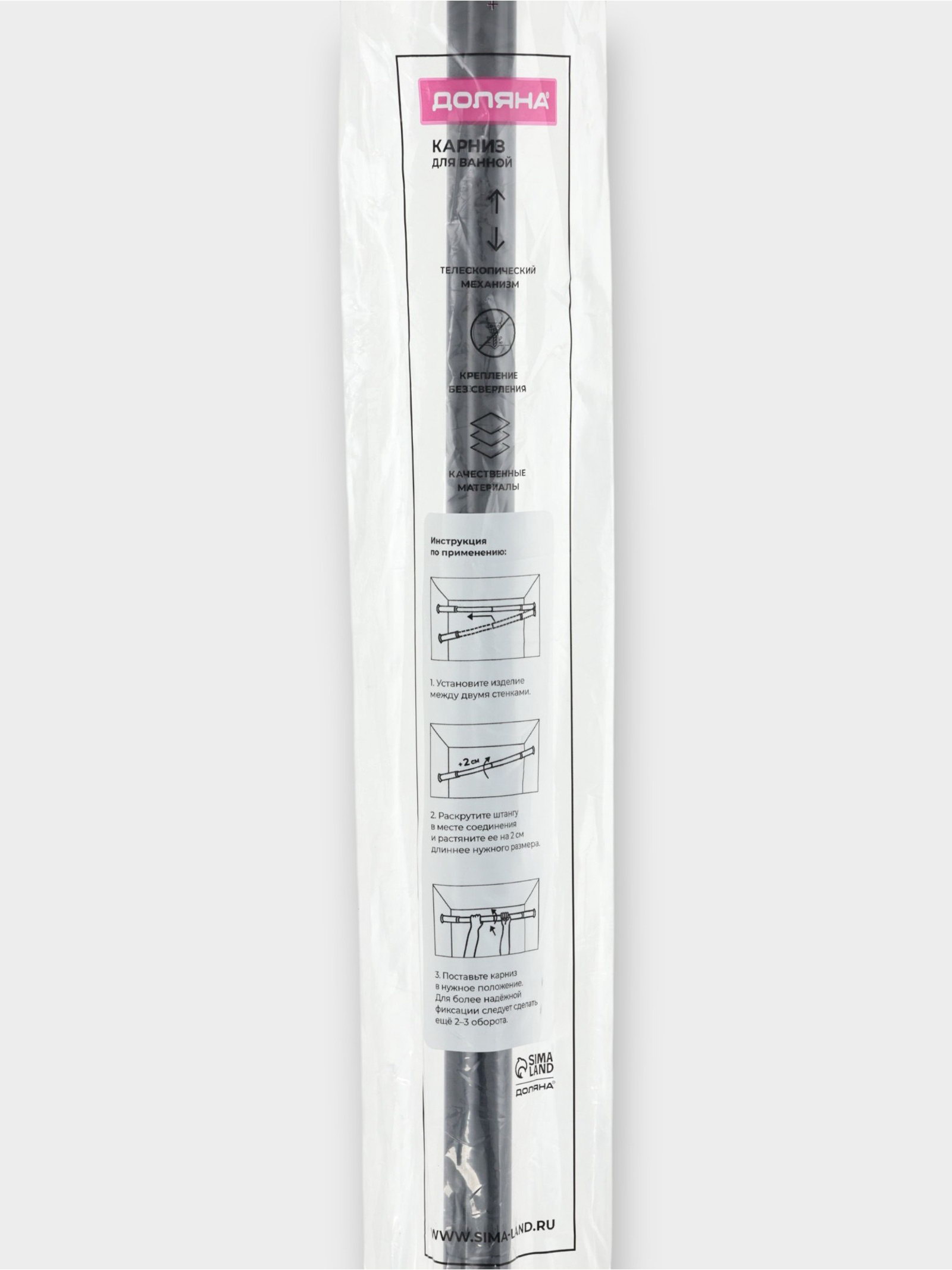 Вид карниза: Прямой, Телескопический Длина, см: 116, 220 Размер упаковки: 7 x 5 x 116 см. tnved: 8302419000 Цвет: Чёрный Кольца в комплекте: Нет Телескопический карниз "Блеск" это удобное решение для установки шторы в ванной комнате без сверления стен. Благодаря раздвижной конструкции и надёжному распорному механизму, изделие легко подстраивается под нужную ширину и быстро монтируется. Основные преимущества