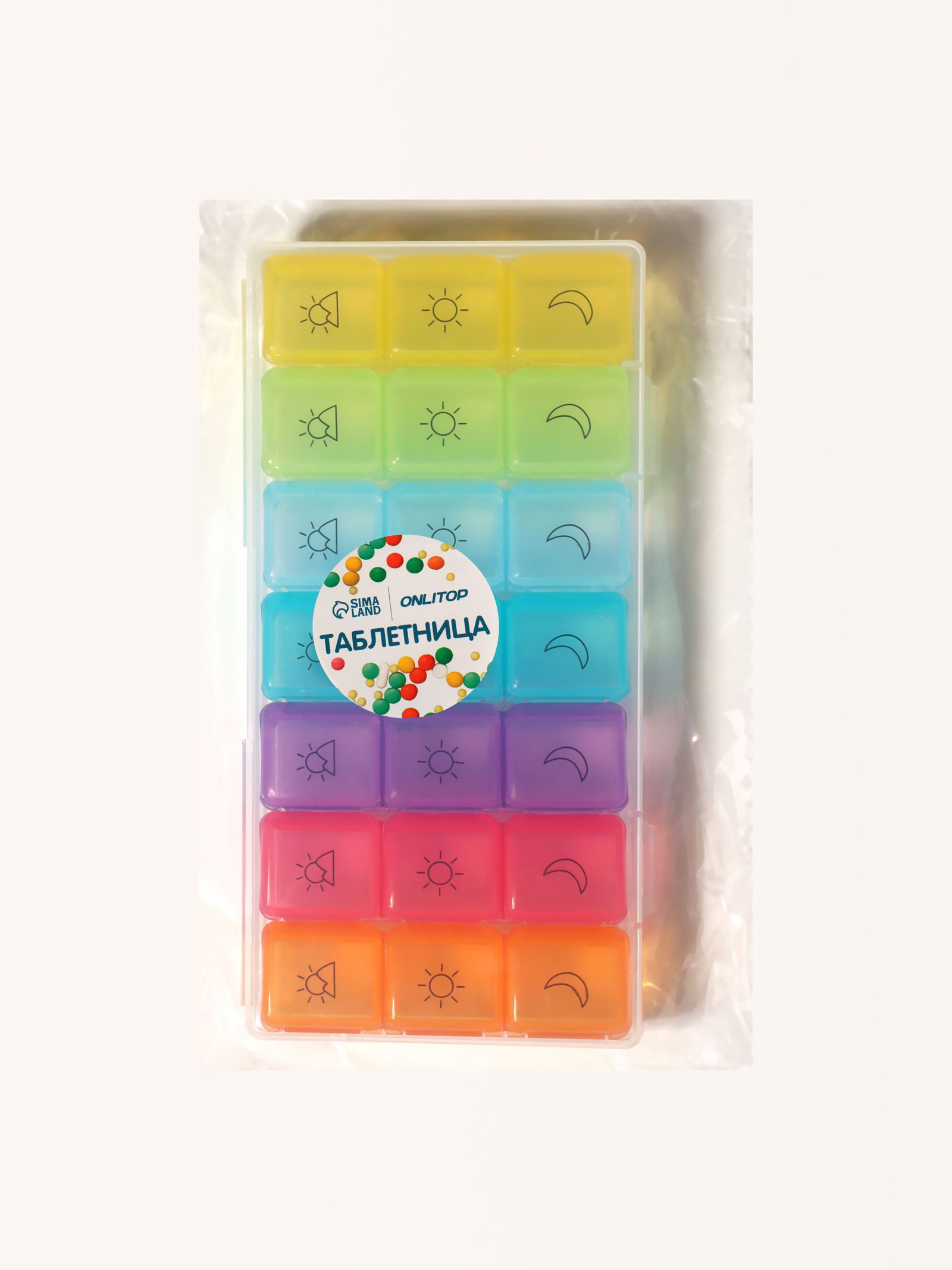 Таблетница - органайзер "Неделька", съёмные ячейки, утро/день/вечер, 17.4x8.2x2.5 см, 7 контейнеров по 3 секции, разноцветная, 8.2x17.4x2.5 см., ONLITOP, Китай