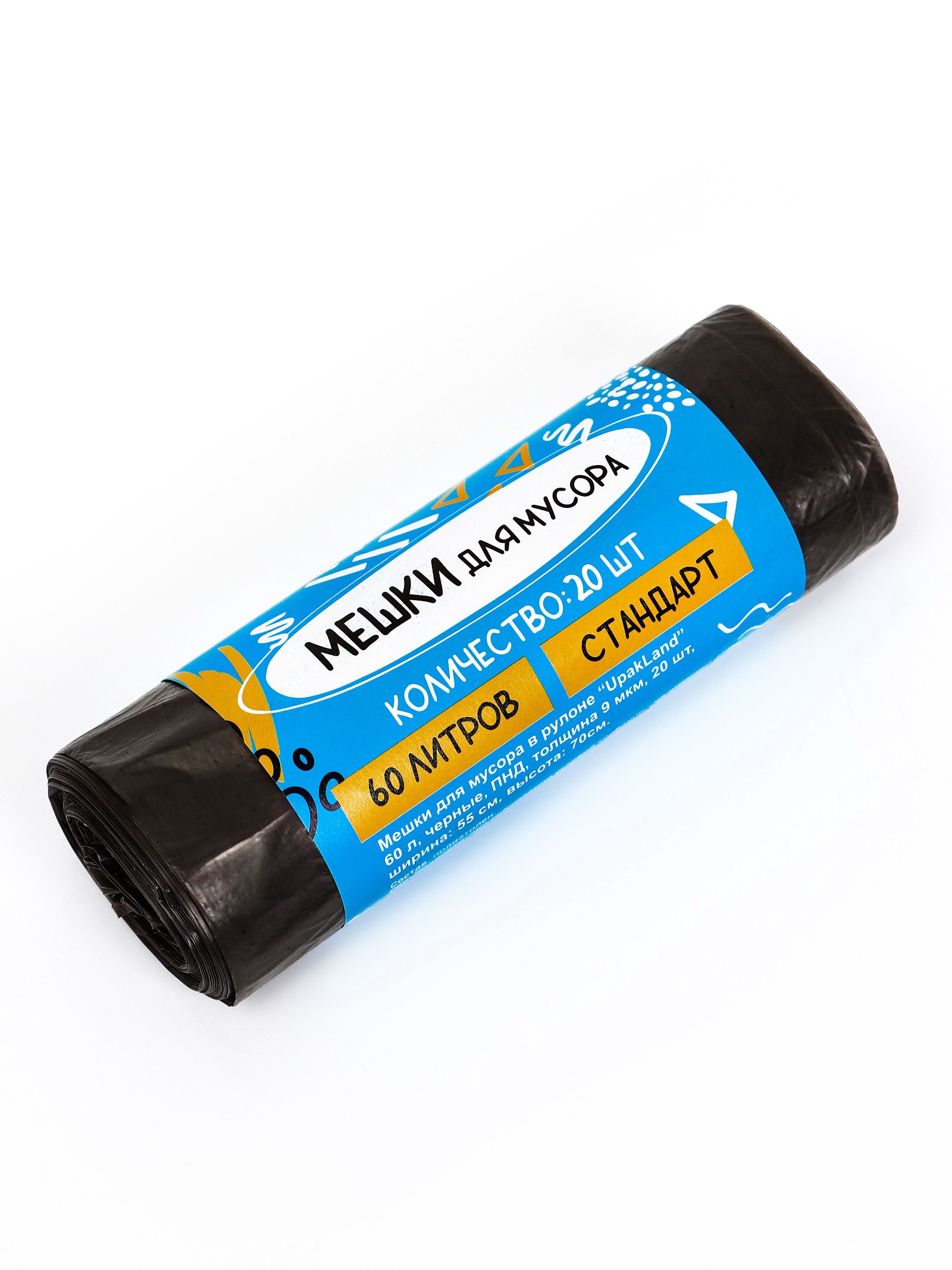 Мешки для мусора в рулоне 60 л, черные, ПНД, 9 мкм, 55 x 70 см 20 шт., 60000 мл., UPAK LAND, Россия
