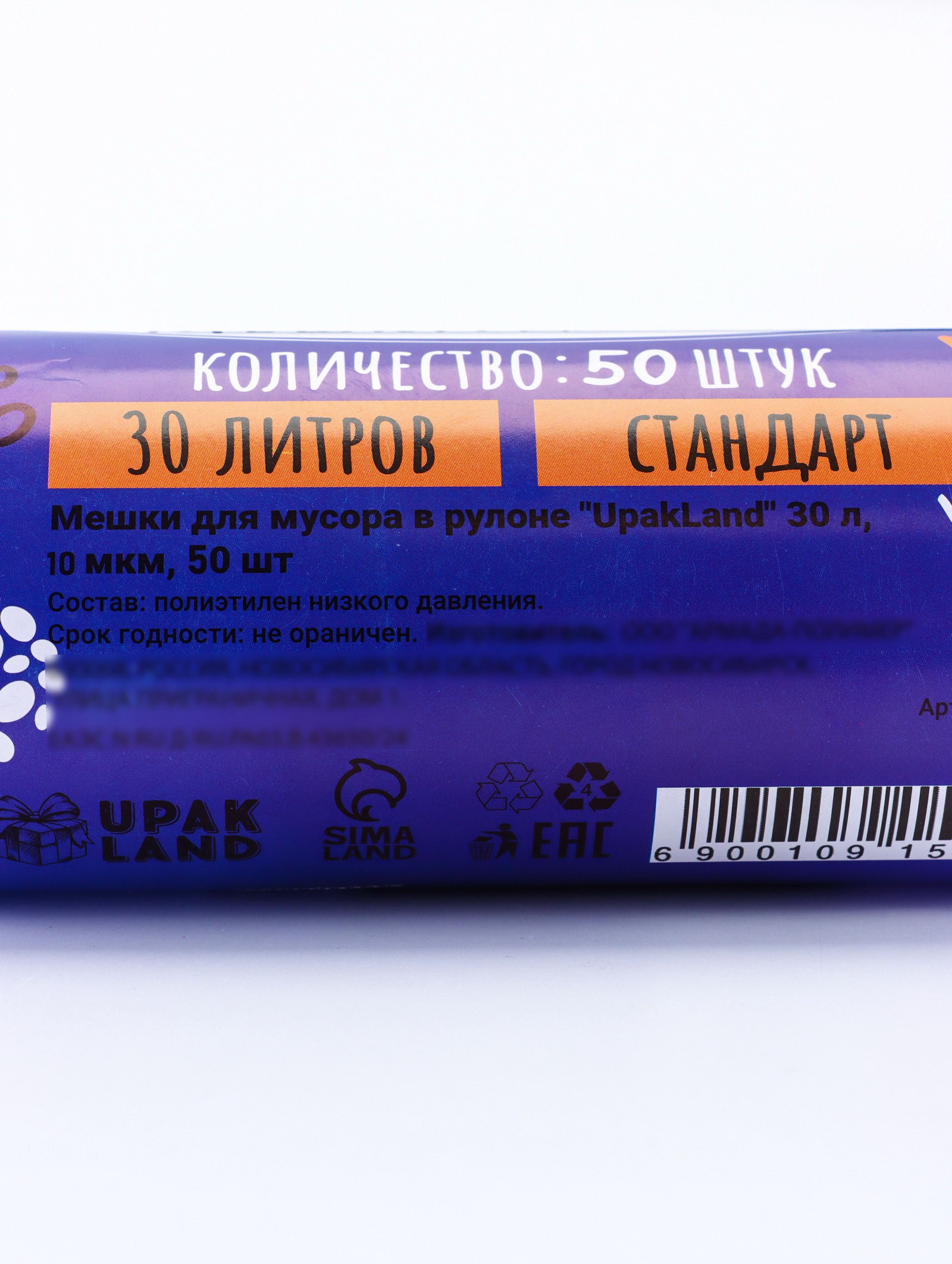 Мешки для мусора в рулоне, 30 л, черные, ПНД, толщина 10 мкм, 50 шт., 30000 мл., UPAK LAND, Россия