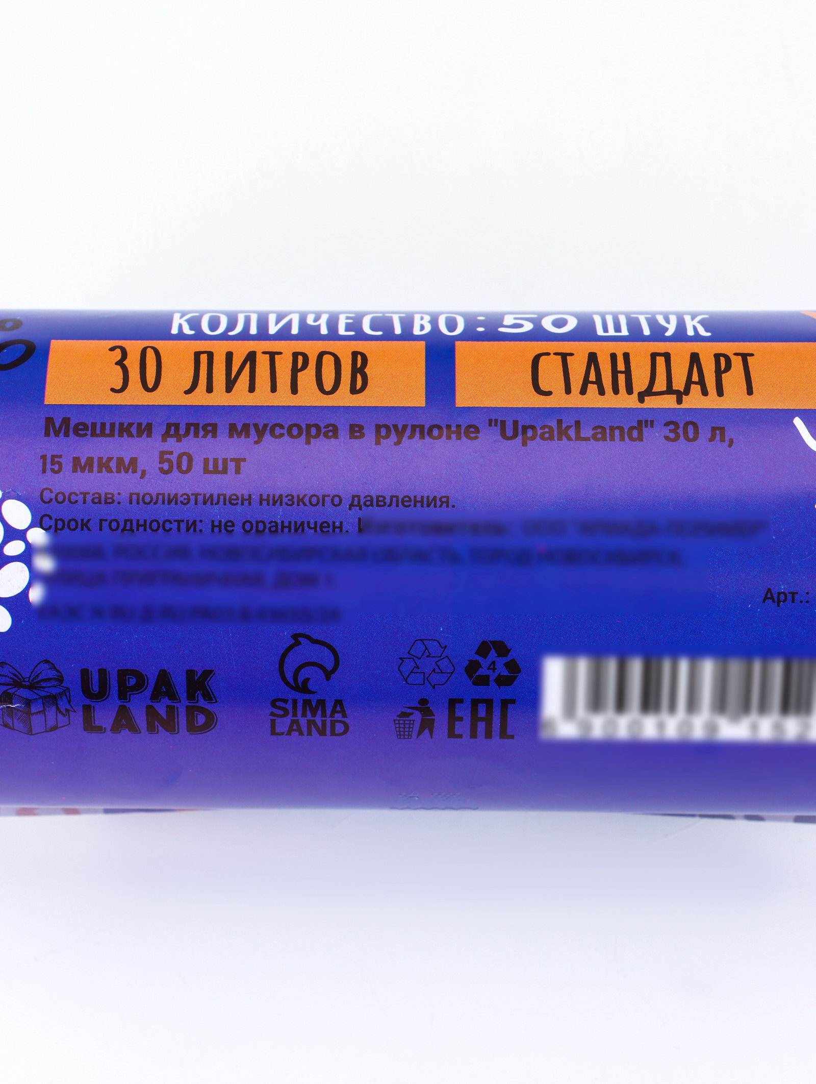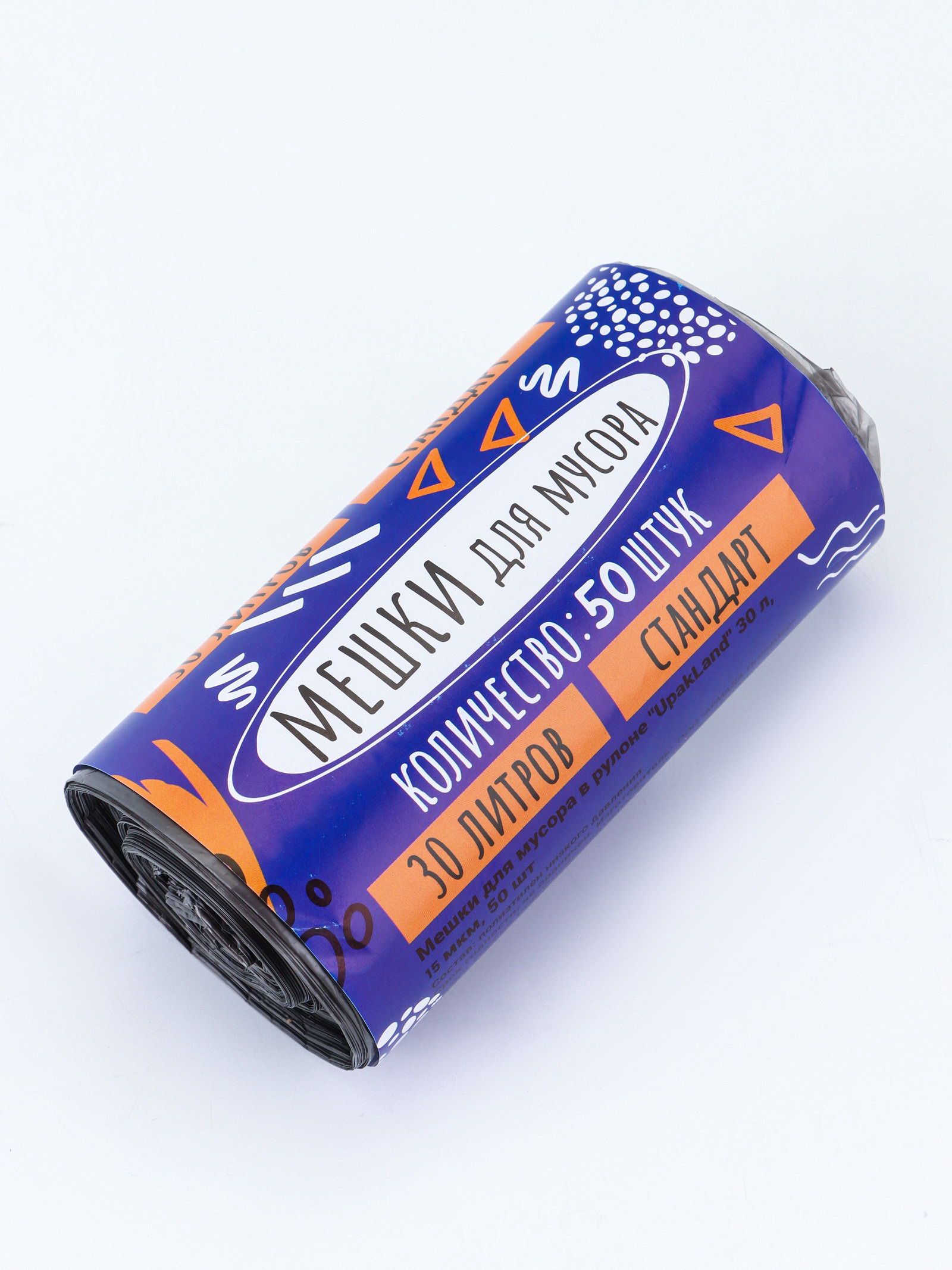 Мешки для мусора в рулоне 30 л, черные, ПНД, толщина 15 мкм, 50 шт., 30000 мл., UPAK LAND, Россия
