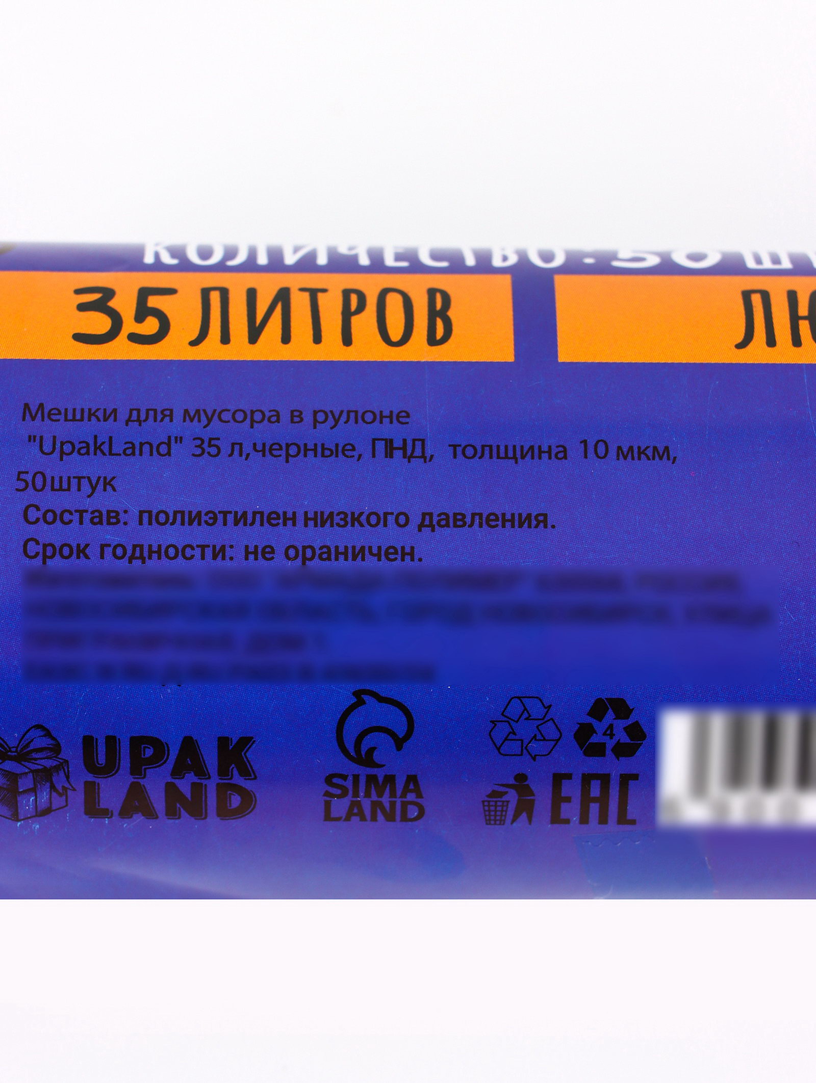 Мешки для мусора 35 л, ПНД толщина 10 мкм, 50 шт. в рулоне, чёрные, 35000 мл., UPAK LAND, Россия