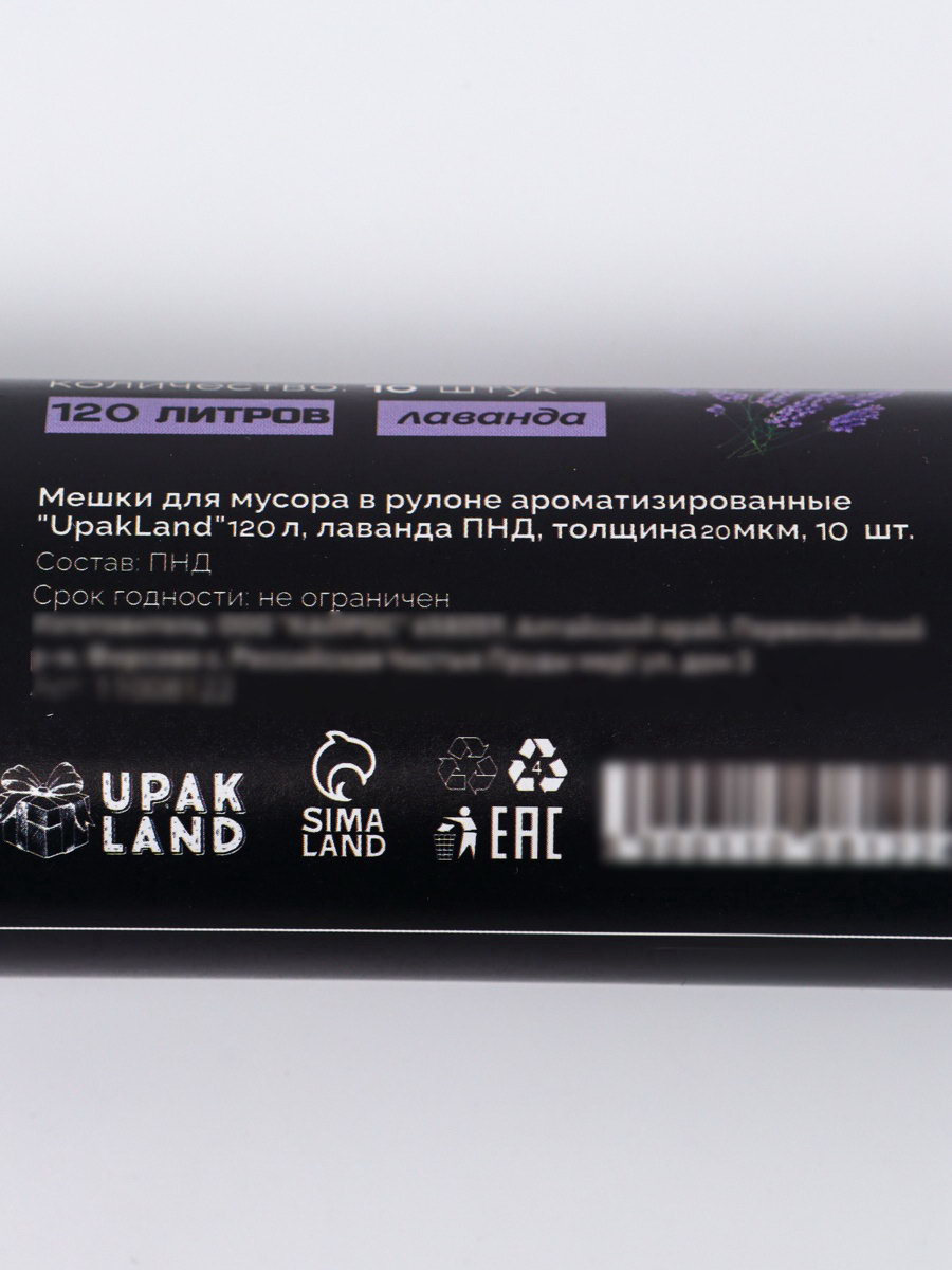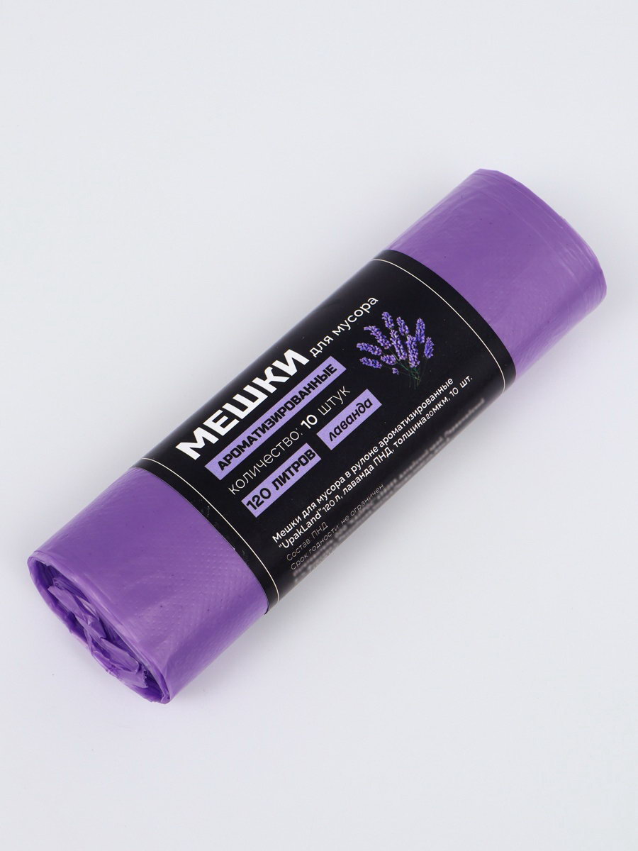 Мешки для мусора в рулоне ароматизированные UpakLand 120 л, лаванда ПНД, толщ 20 мкм, 10 шт., 120000 мл., UPAK LAND, Россия