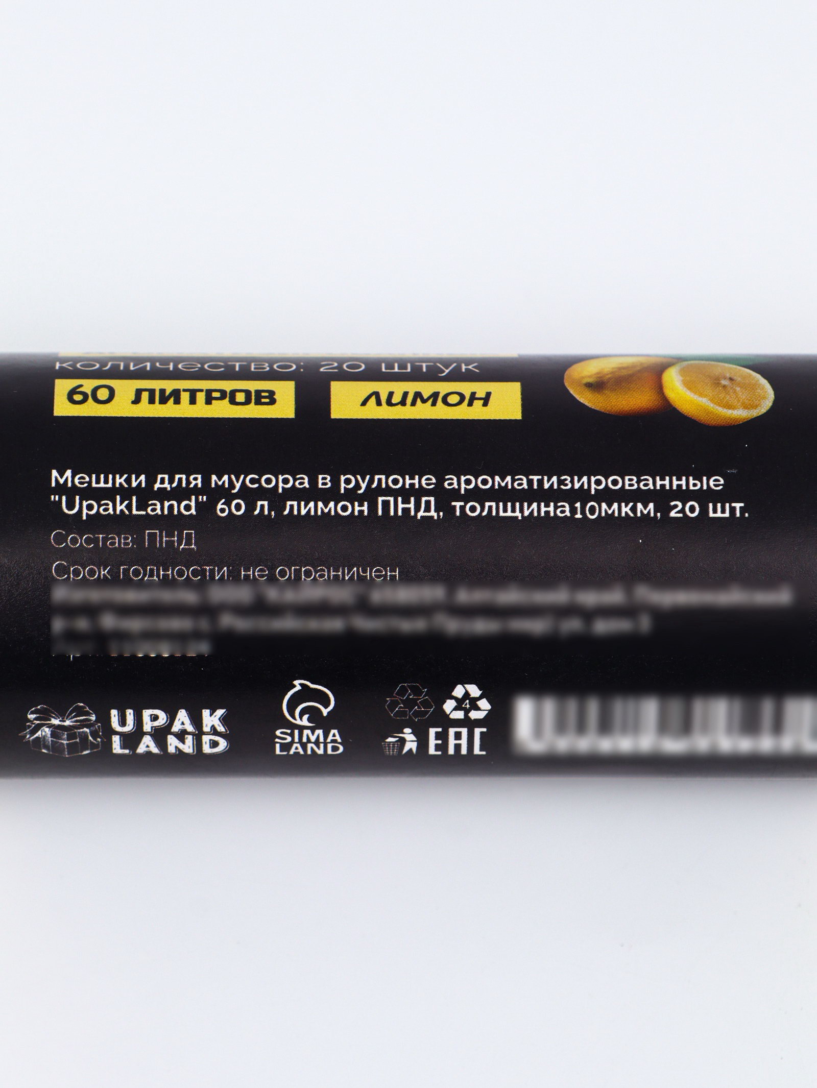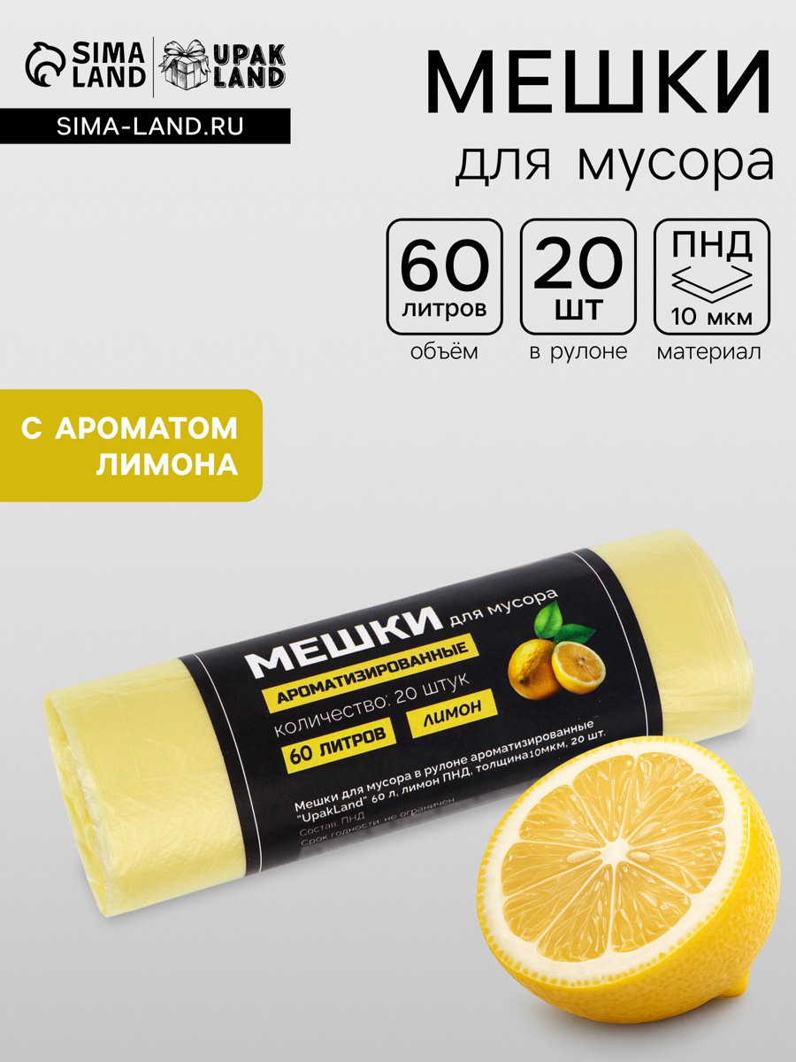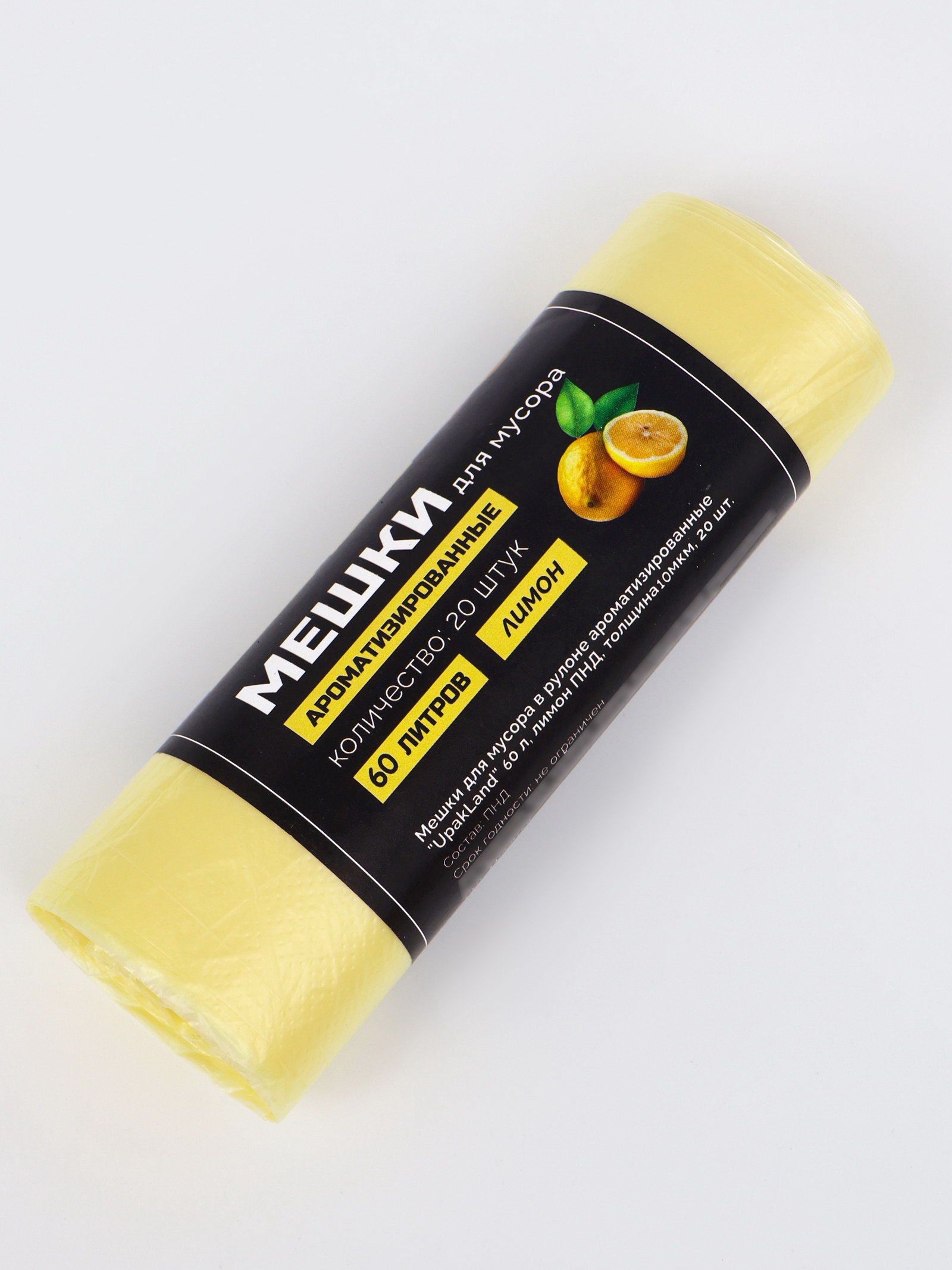 Мешки для мусора в рулоне ароматизированные UpakLand 60 л, лимон ПНД, толщина 10 мкм, 20 шт., 60000 мл., UPAK LAND, Россия