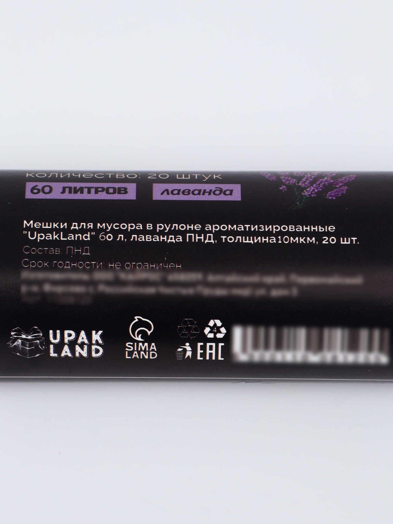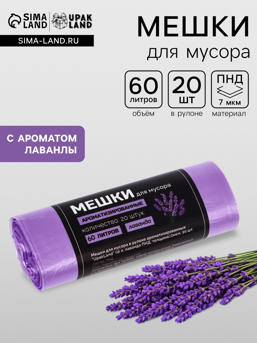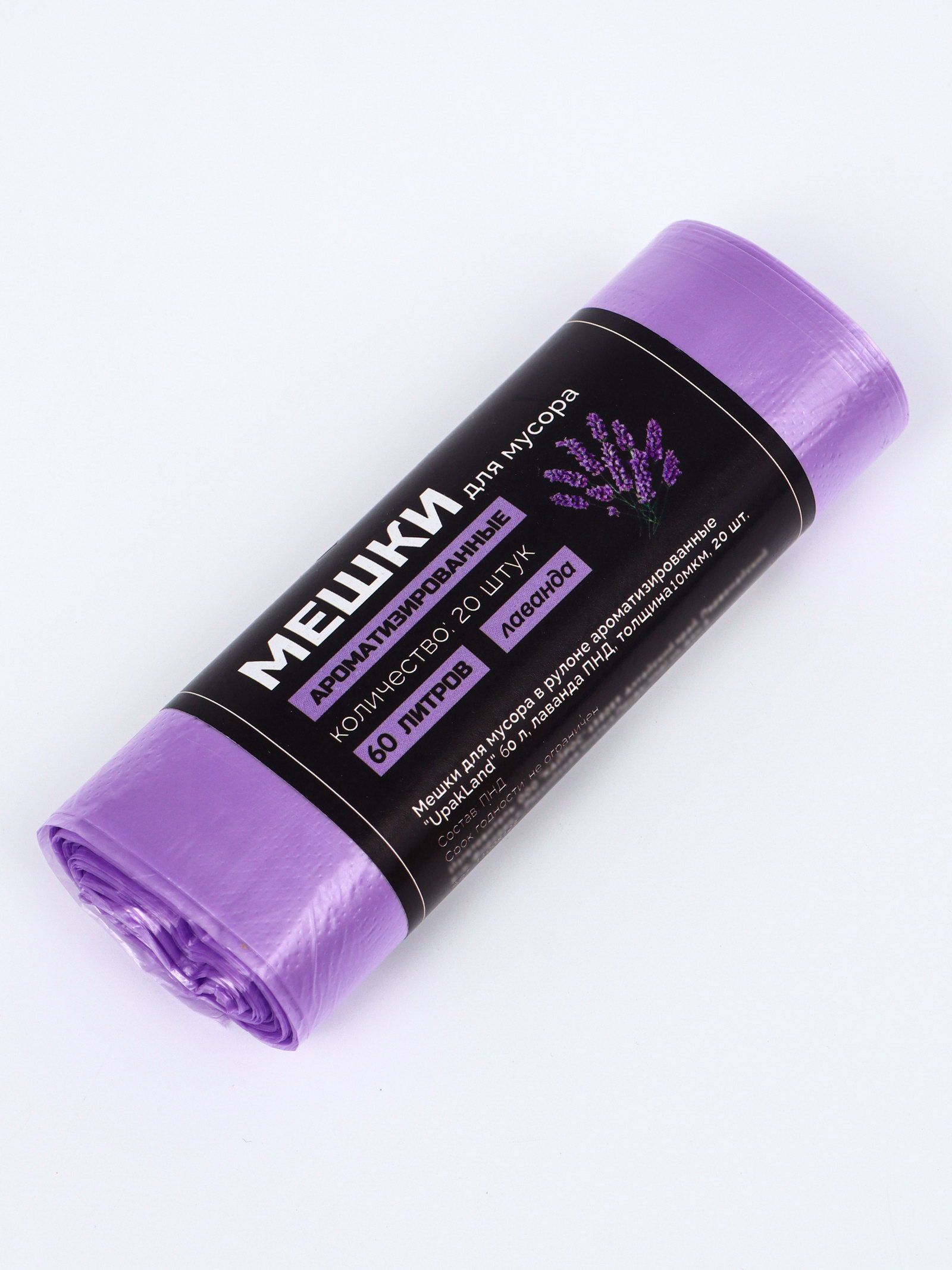 Мешки для мусора в рулоне ароматизированные UpakLand 60 л, лаванда ПНД, толщ 10 мкм, 20 шт., 60000 мл., UPAK LAND, Россия