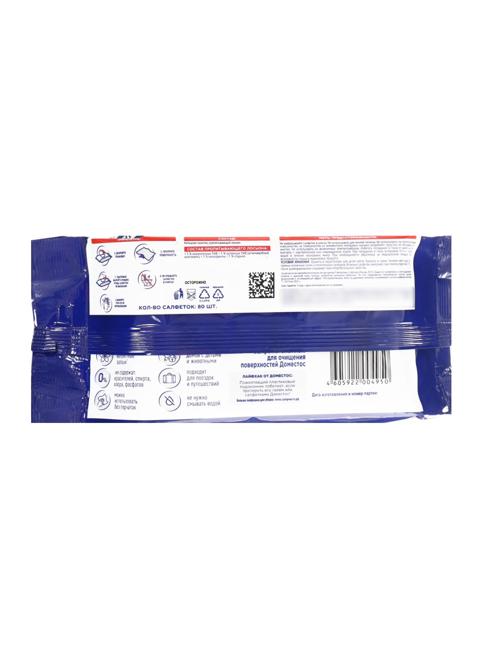 Не требует смывания. Меры предосторожности:Избегать попадания в глаза. Не использовать для личной гигиены. Хранить плотно закрытым, в недоступном для детей месте. Салфетки Domestos это быстрый и удобный способ поддерживать чистоту и порядок в доме каждый день без лишних усилий. | ||