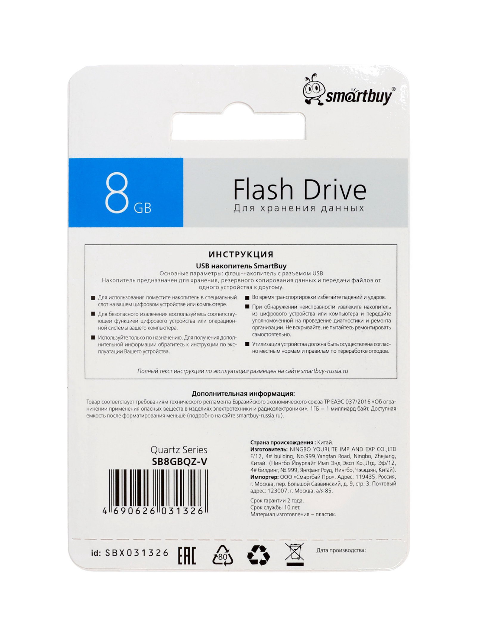 Флешка Quartz series Violet, 8 Гб, USB 2.0, чтение до 25 Мб/с, запись до 15 Мб/с, фиолетовая, Smartbuy, Китай
