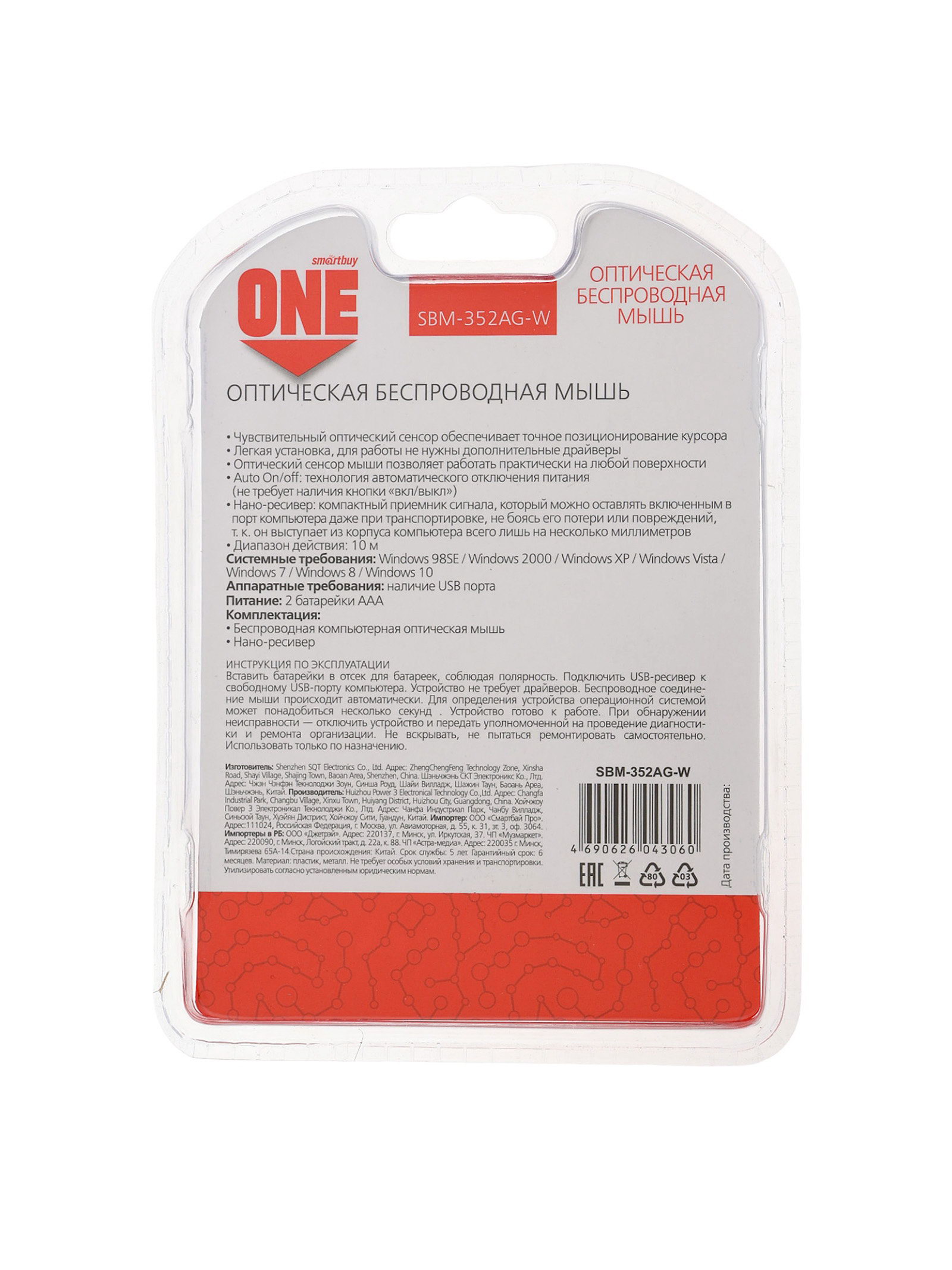 Мышь ONE 352, беспроводная, оптическая, 4 кнопки, 1600 dpi, USB, 1хАА, белая, Smartbuy, Китай