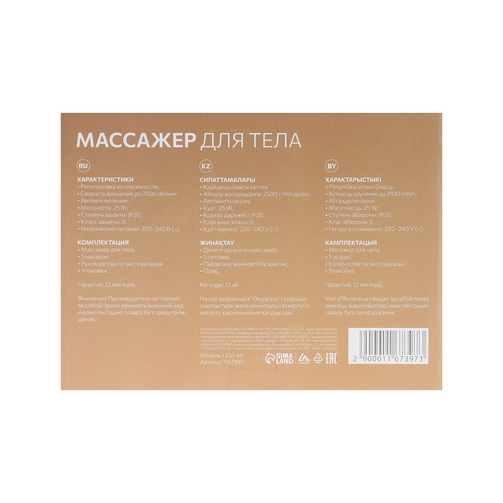 Цвет: Белый, Синий Вид массажа: Антицеллюлитный, Роликовый Размер упаковки: 18.5 x 11 x 25.5 см. Тип массажёра: Массажёр с ручкой Область применения: Для тела Продуваемая расчёска: Нет Тип питания: От сети 220 В tnved: 9019101000 Гарантийный срок, мес.: 12 Количество насадок: 5 Количество режимов: 1 Товар Каспи: Вибромассажеры Автоматическое отключение: Нет Инфракрасный прогрев: Нет Массажер для тела Luazon LEM-44 с функциями роликового и антицеллюлитного массажа поможет расслабиться после тяжелого трудового дня и проработать проблемные зоны. В комплекте с устройством есть несколько типов насадок, которые позволяют эффективно воздействовать на разного рода проблемы: