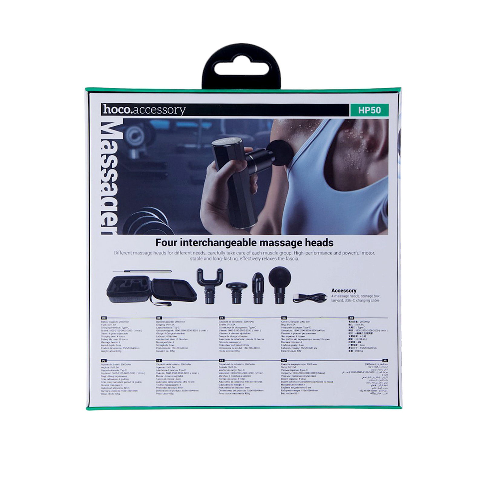 Массажёр для тела HP50, перкуссионный, 4 режима, 4 насадки, 3200 об/мин, чёрный, 17x5x20 см., Hoco, Китай
