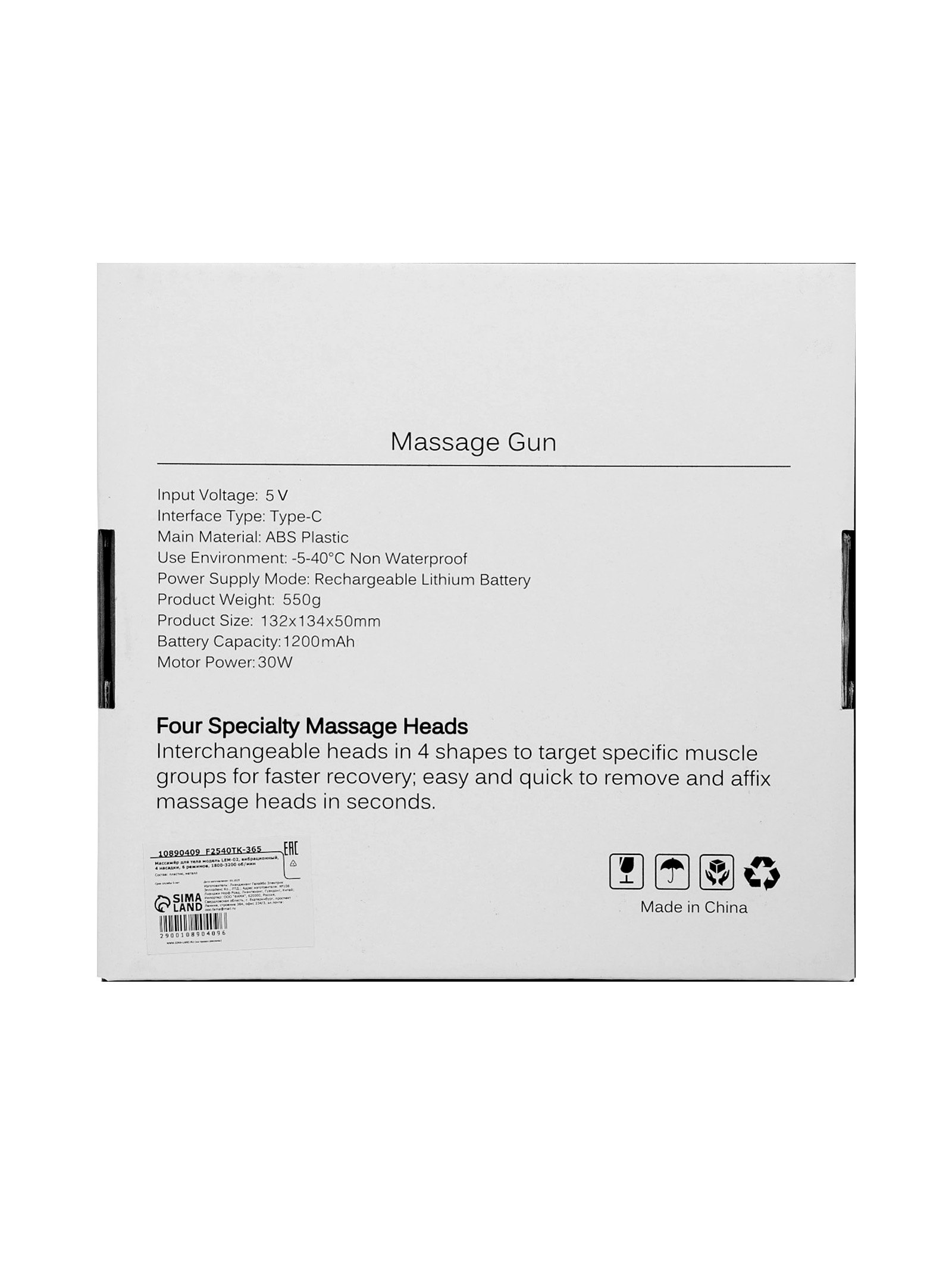 Тип массажёра: Вибромассажёр, Массажный пистолет, Перкуссионный Вид массажа: Вибрационный, Перкуссионный Размер упаковки: 21 x 6 x 20 см. tnved: 9019101000 Гарантийный срок, мес.: 6 Цвет: Чёрный Тип питания: От аккумулятора Количество насадок: 4 Инфракрасный прогрев: Нет Количество режимов: 6 Область применения: Универсальный Этот массажный пистолет предлагает глубокое расслабление мышц благодаря вибрации, достигая скорости от 1800 до 3200 оборотов в минуту. Шесть режимов работы и четыре специальные массажные головки адаптируют массаж под индивидуальные нужды, помогая снять усталость и напряжение после тренировок или долгого дня. Чёрный корпус из прочного АБС-пластика весом 550 г и размерами 132x134x50 мм с эргономичной рукояткой обеспечивает комфортное использование, а мощность двигателя в 30 Вт гарантирует эффективную работу. Питание от перезаряжаемой литиевой батареи ёмкостью 1200 мАч с зарядкой через USB-Type-C и входным напряжением 5 В позволяет применять устройство в любом месте без привязки к розетке.