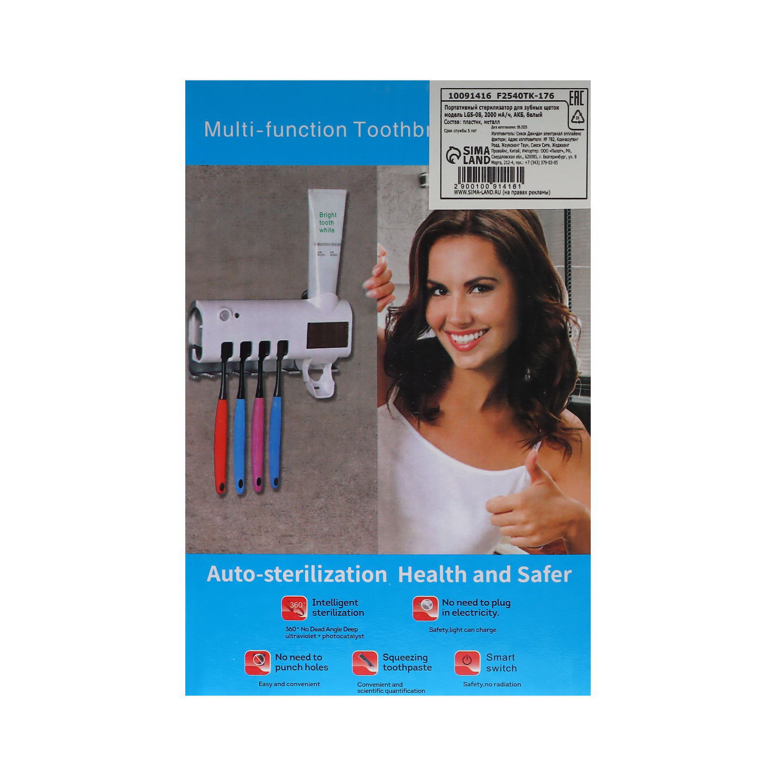 Портативный стерилизатор для зубных щеток LGS-08, 2000 мА/ч, АКБ, белый, 13x20x5.7 см., Китай